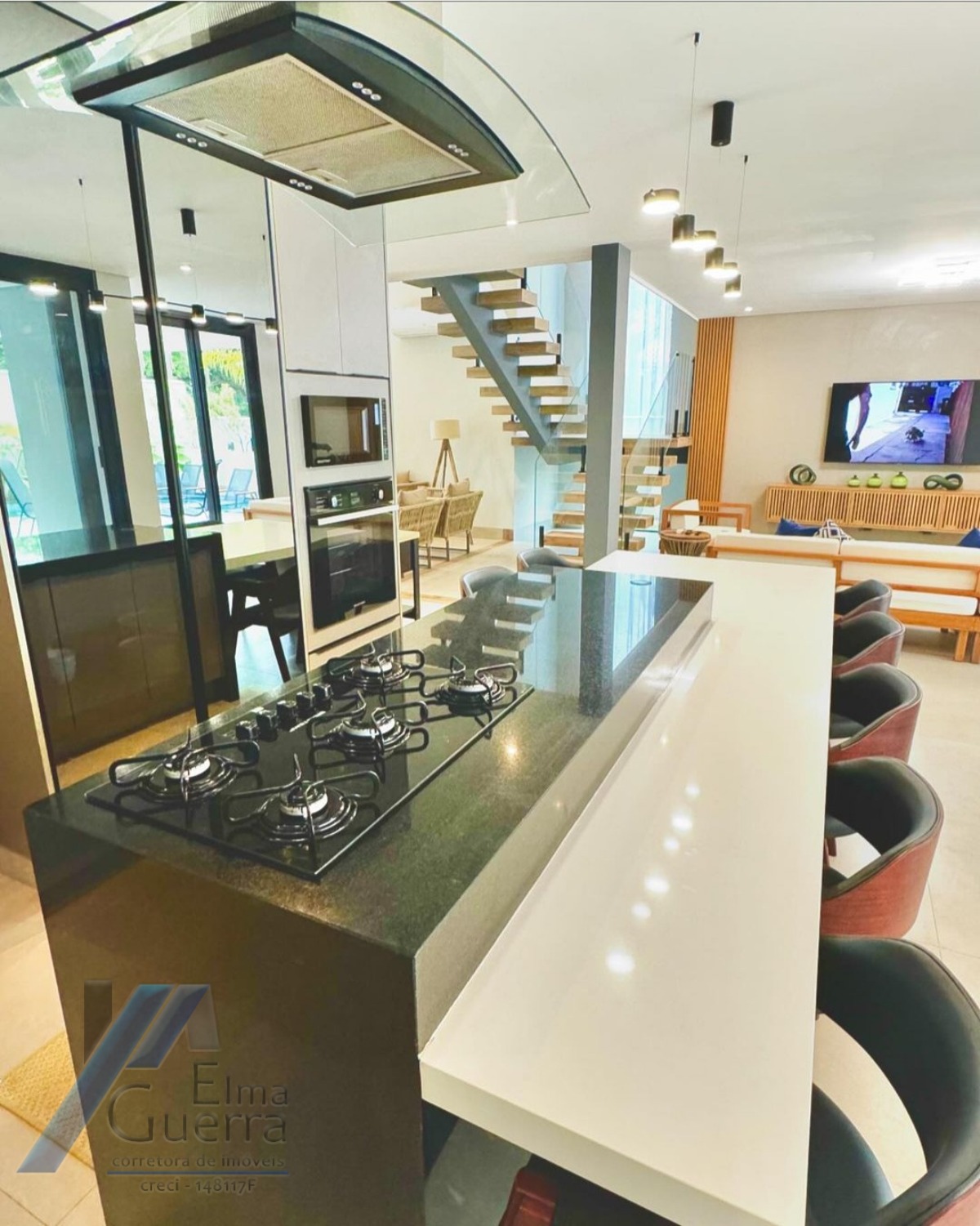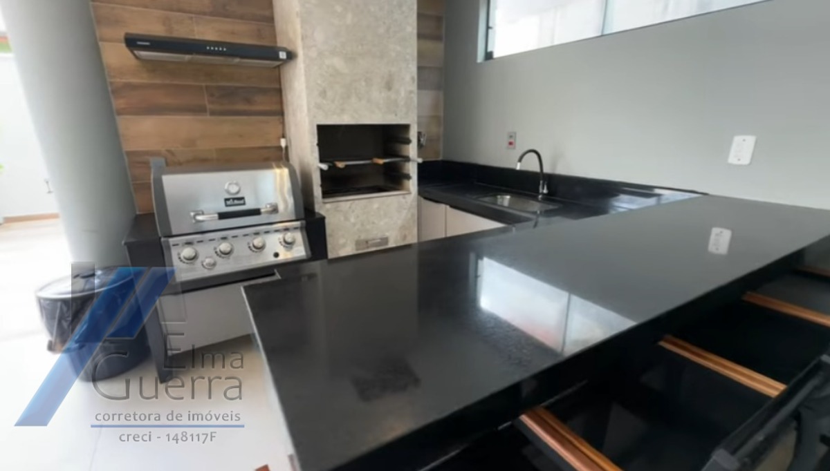Ampla área gourmet equipada com churrasqueira a carvão e a gás integrada com cozinha completa e sala de TV