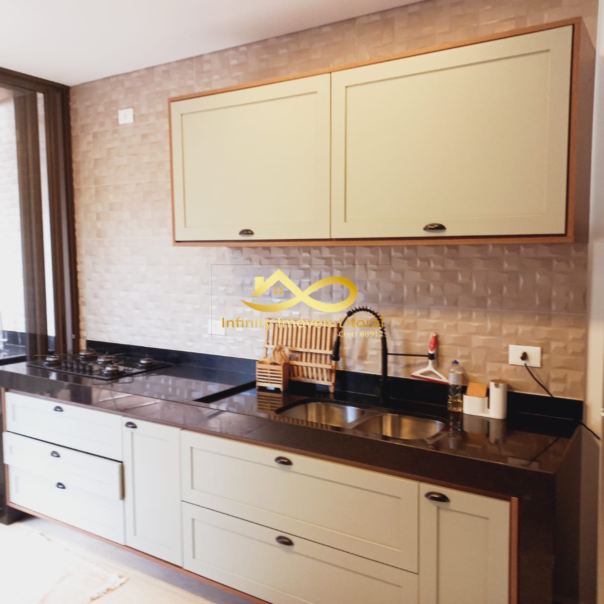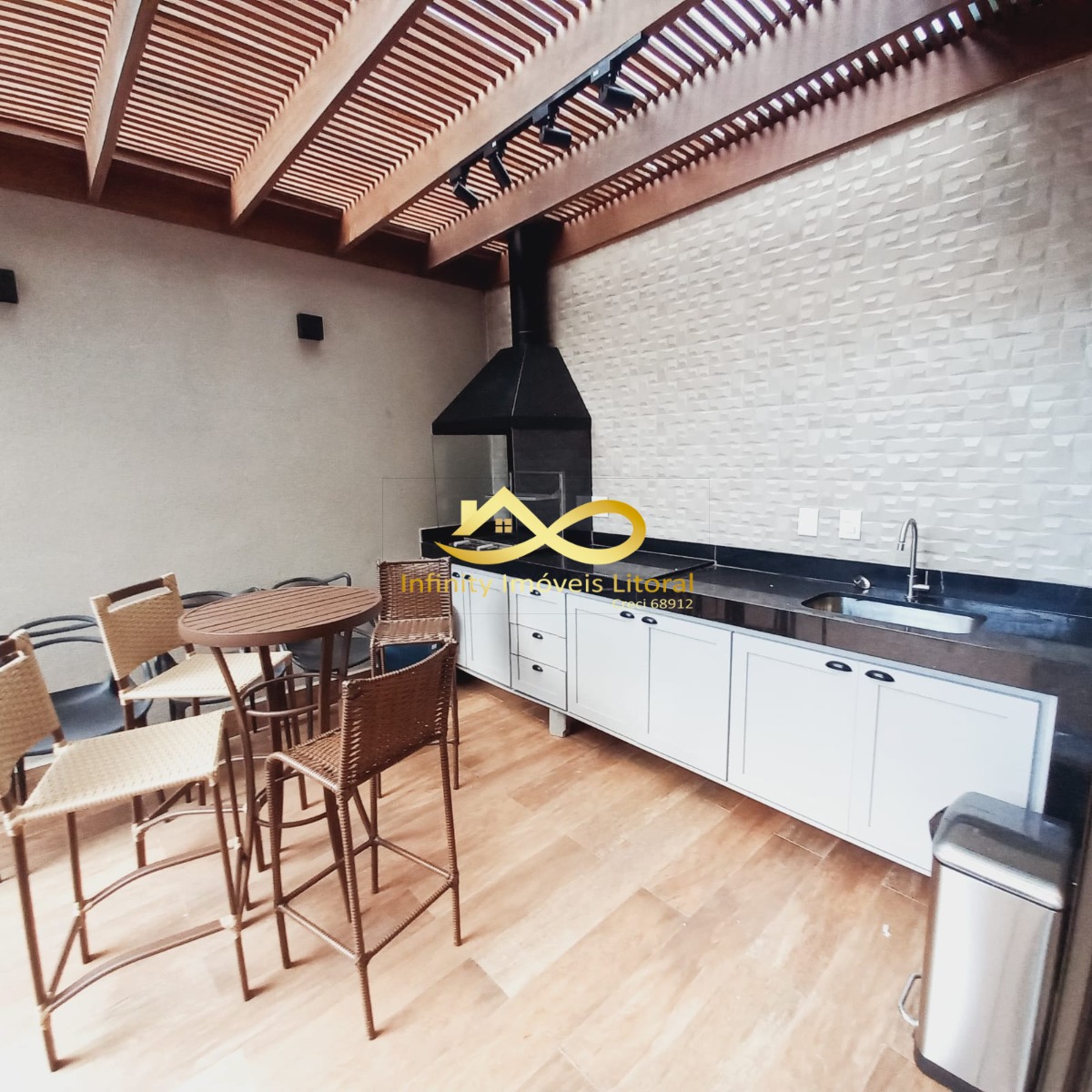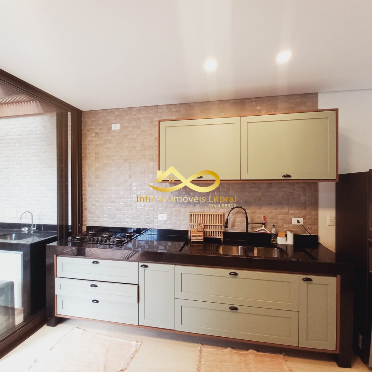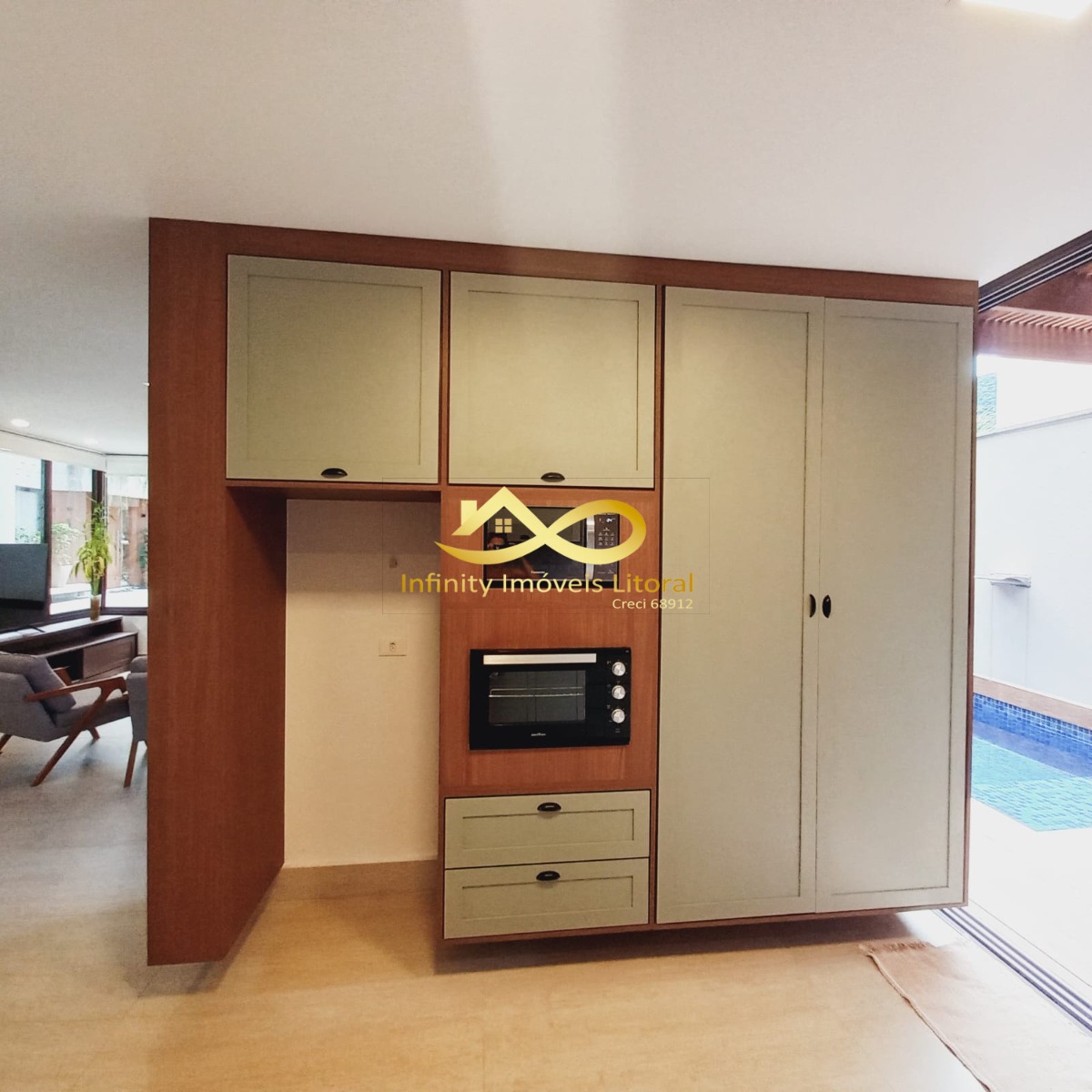 Armários planejados na cozinha, sala e churrasqueira.