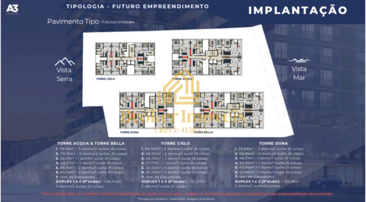 Serão quatro torres com 8 andares e o Nono pavimento misto tipo duplex, 6 sendo apartamentos por andar, totalizando 216 cotas.