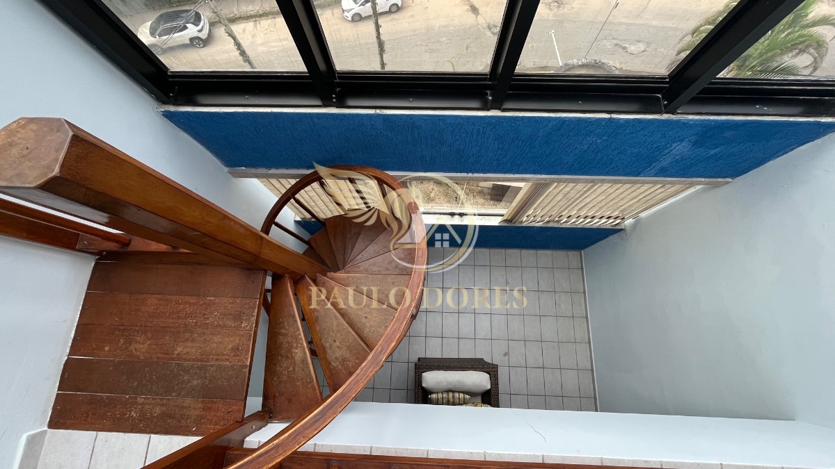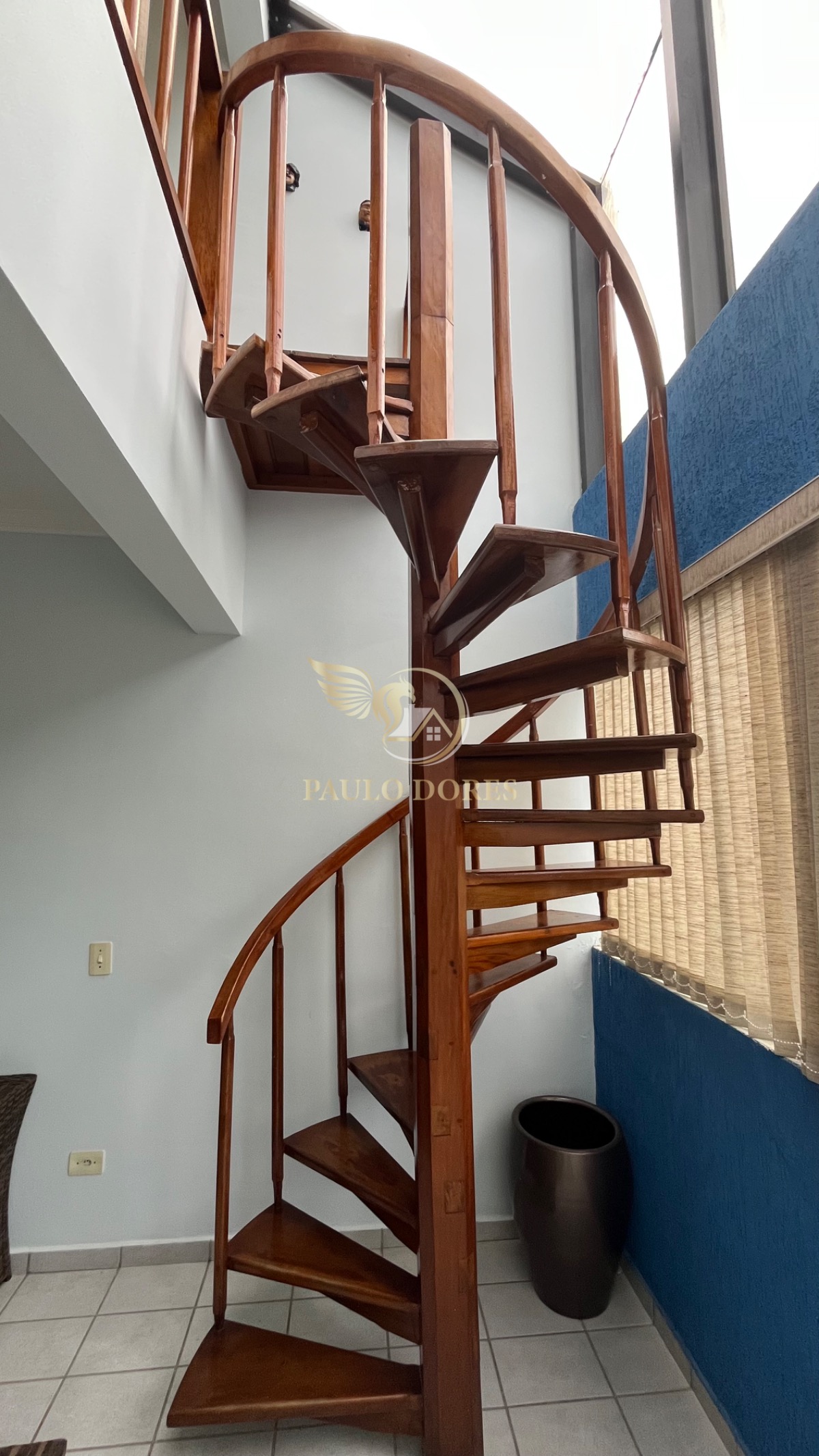 Acesso ao segundo piso por uma bela escada caracol em madeira naval, com destaque para uma janela vasculante que proporciona iluminação e charme ao ambiente.