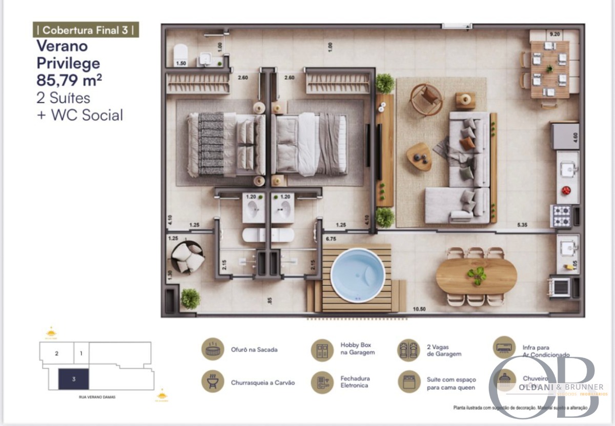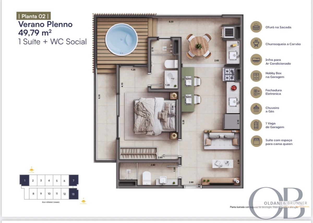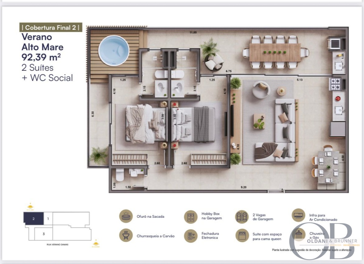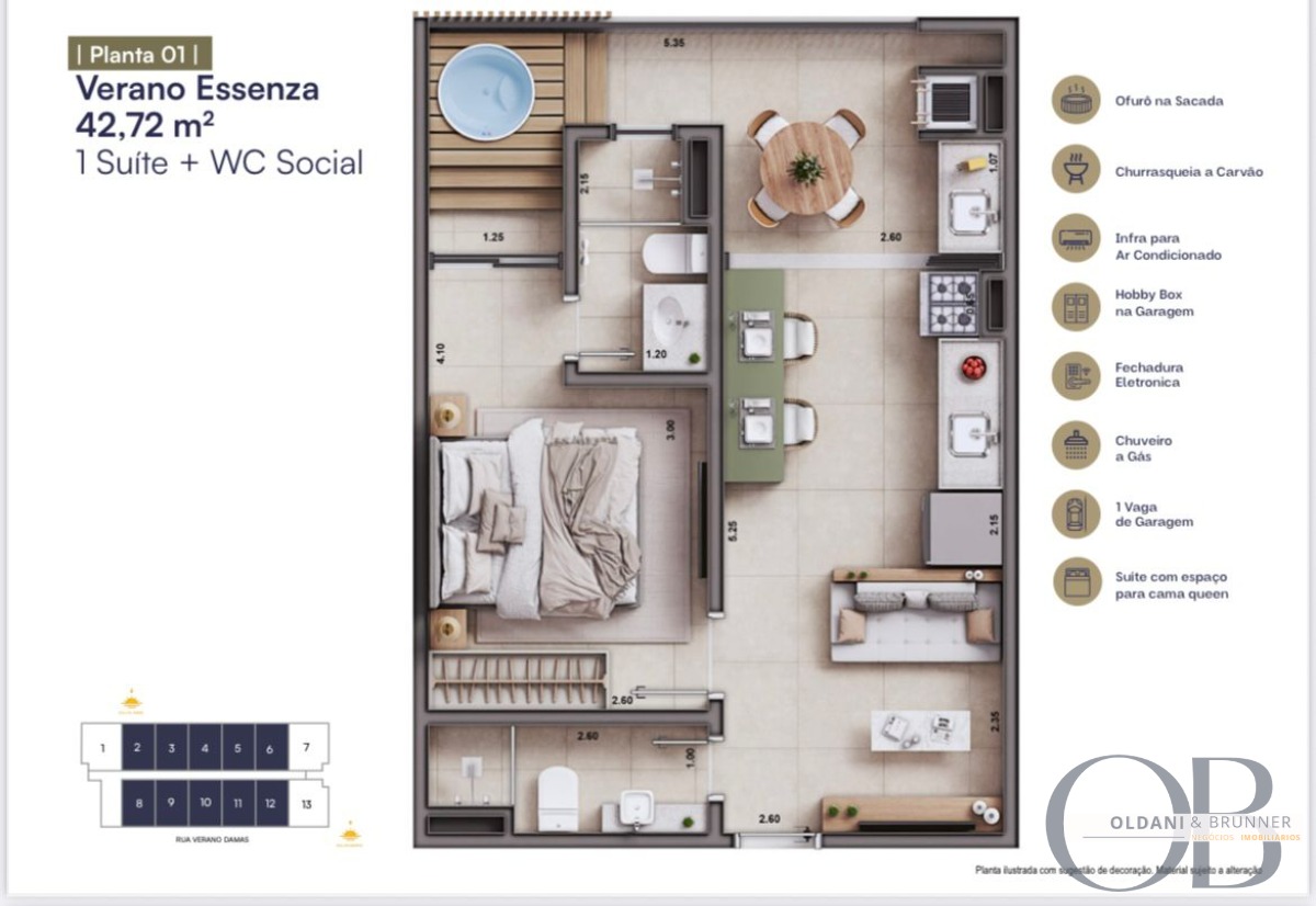 Unidades com 1 ou 2 suítes, todas com:
