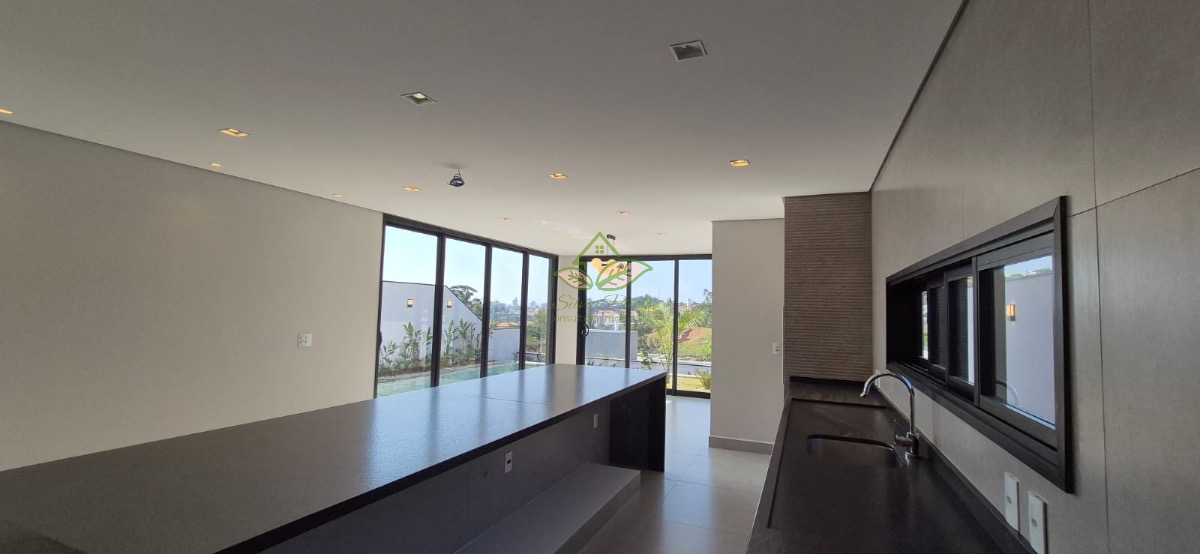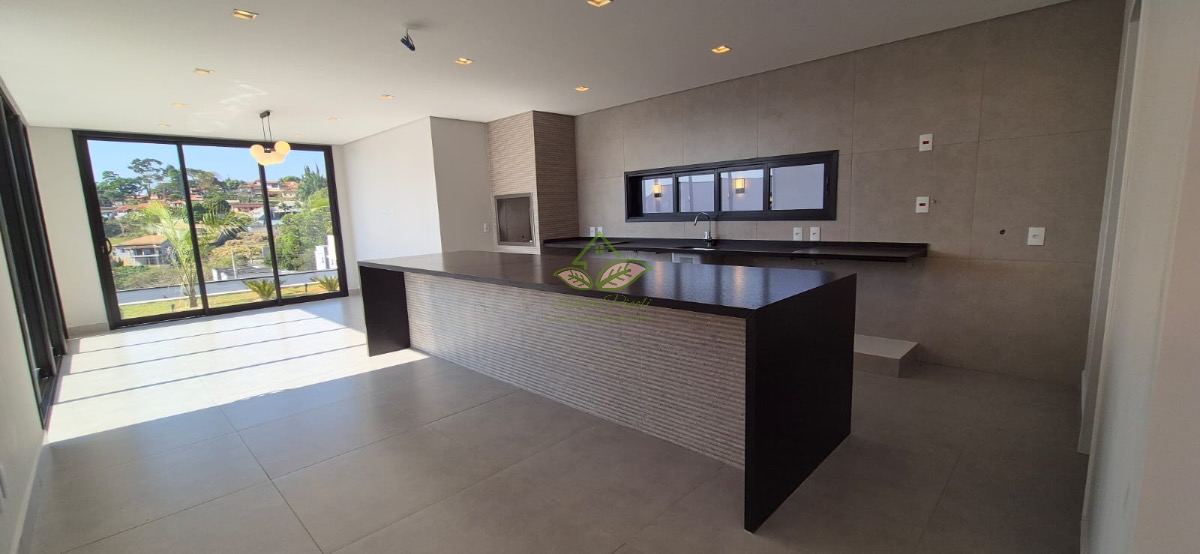 Sala de estar com pé direito duplo, Lareira de 6 metros de altura, Sala de jantar e cozinha gourmet com churrasqueira integrada com ilha (4,00 x 1,20) em conceito aberto, com porta balcão em todos os ambientes, piscina e vestiário completo.
