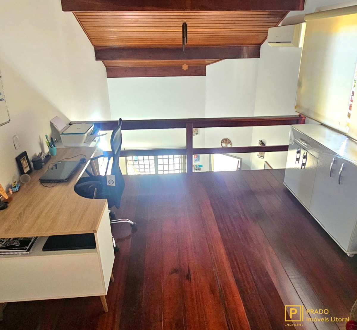 A cozinha é equipada com armários, facilitando a organização, e o mezanino pode ser utilizado como escritório ou espaço adicional.