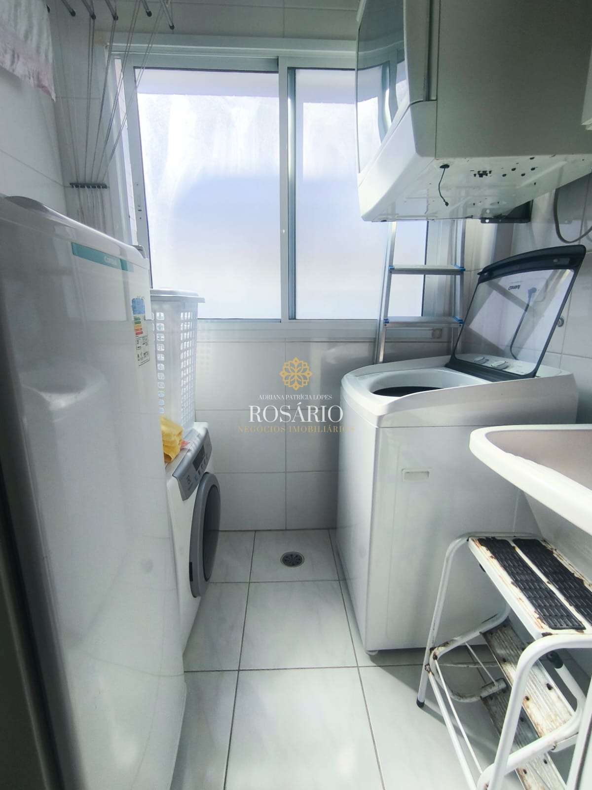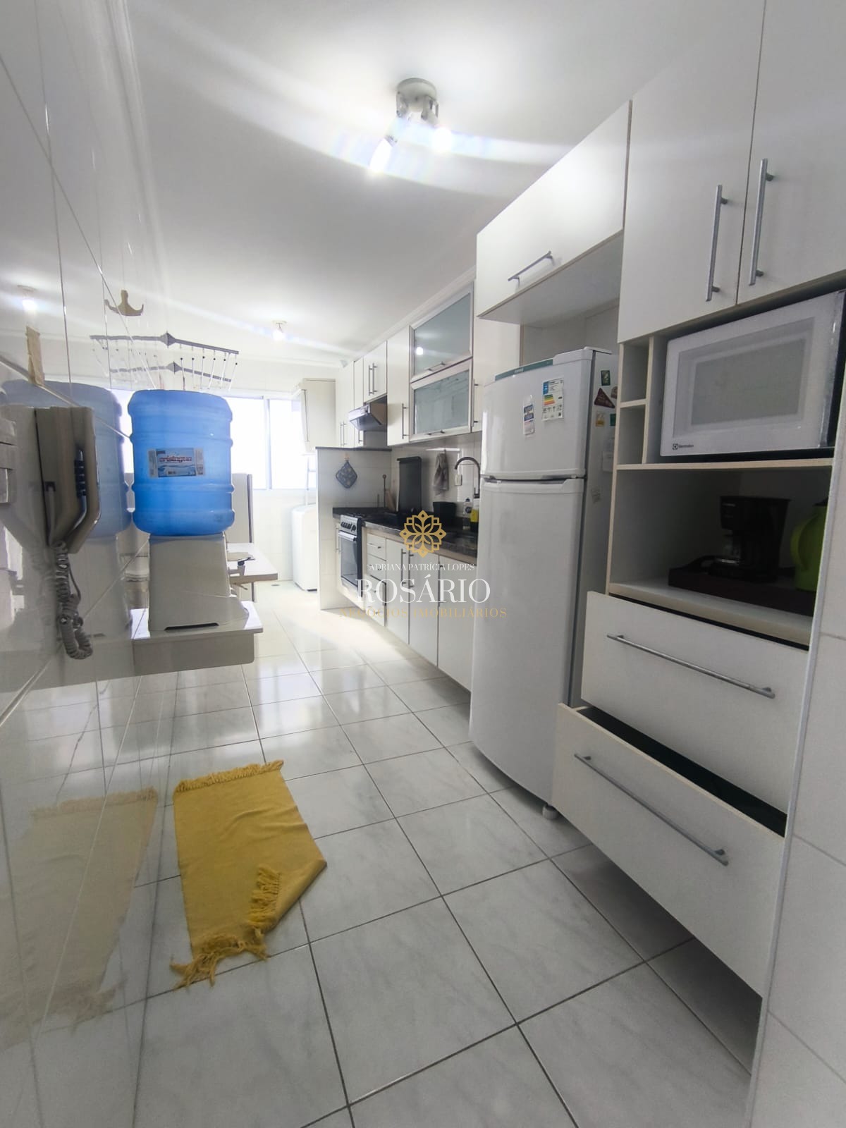 Cozinha completa com armários planejados, eletrodomésticos (geladeira, fogão, micro-ondas, forno, freezer, máquina de lavar e de secar)
