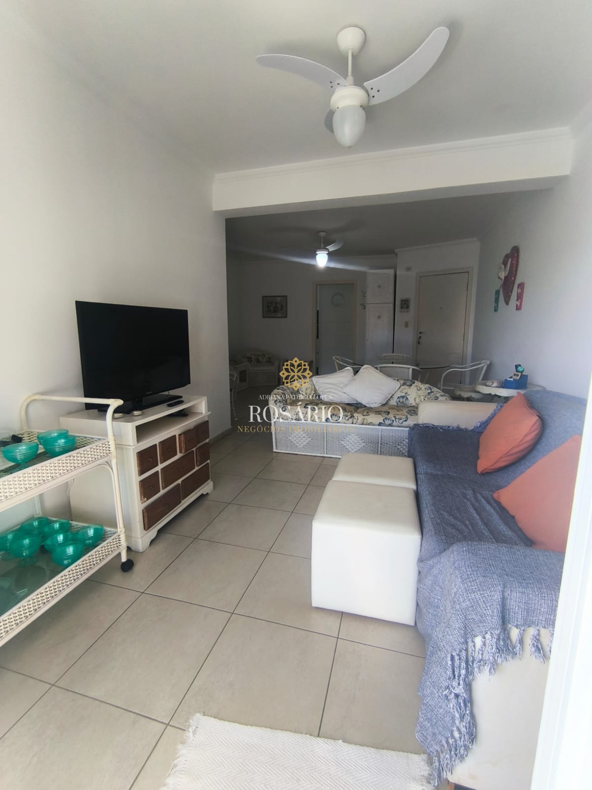 Ampla sala com TV todos os ambientes mobiliados com sofás, poltronas, mesa com cadeiras, ventiladores e ar-condicionado