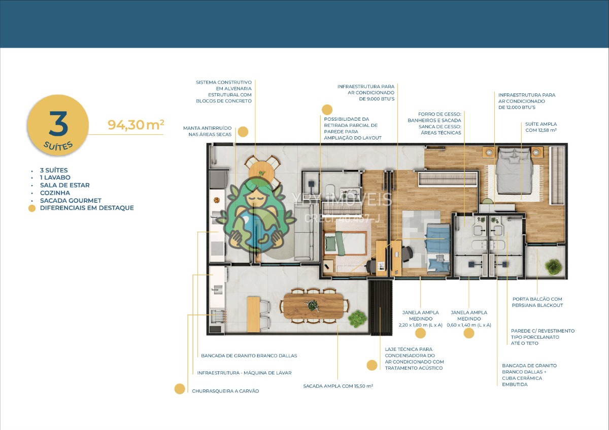 Os apartamentos serão entregues com porcelanato, pias de granito e mármore, churrasqueira a carvão, teto de gesso,