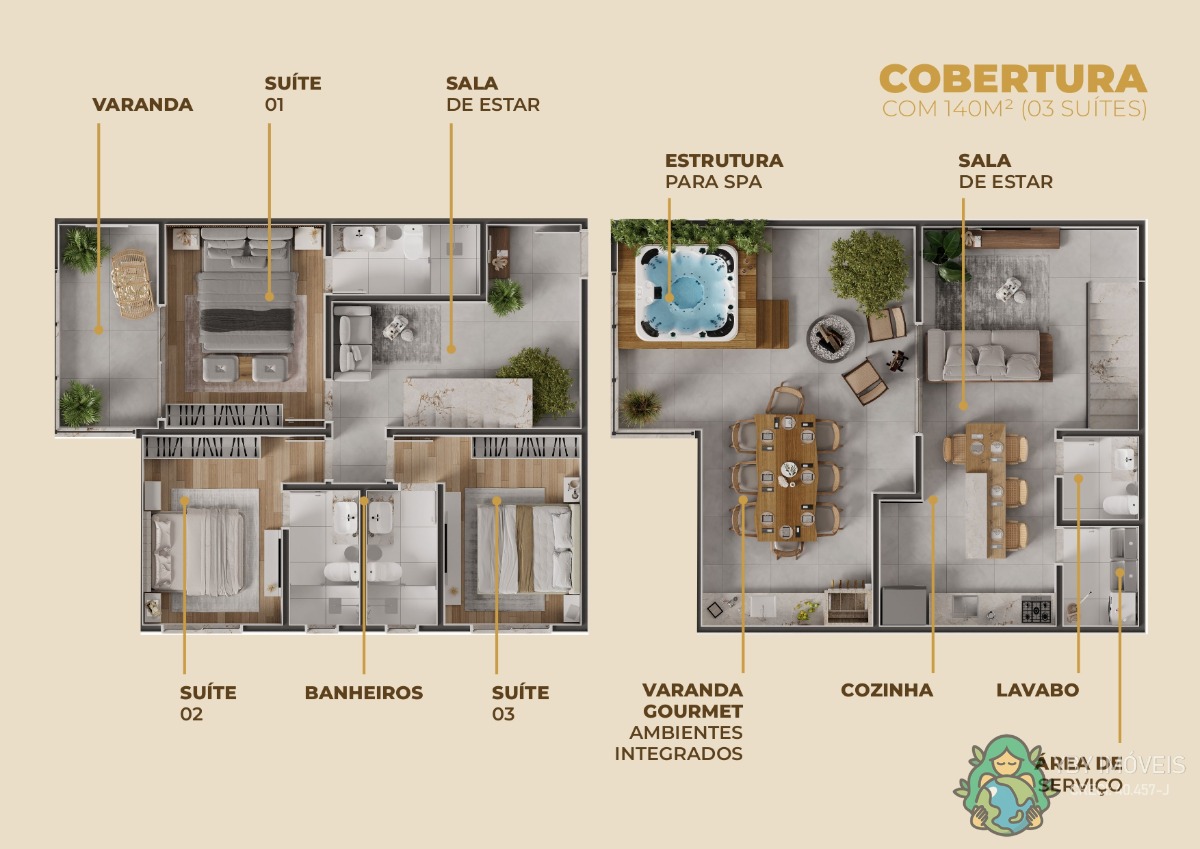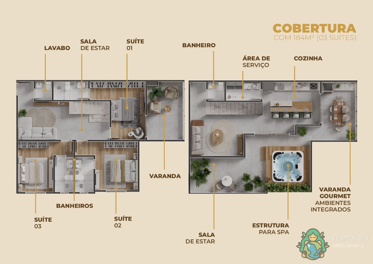 - 03 Suítes (140 e 184m²) com 02 vagas de garagem.