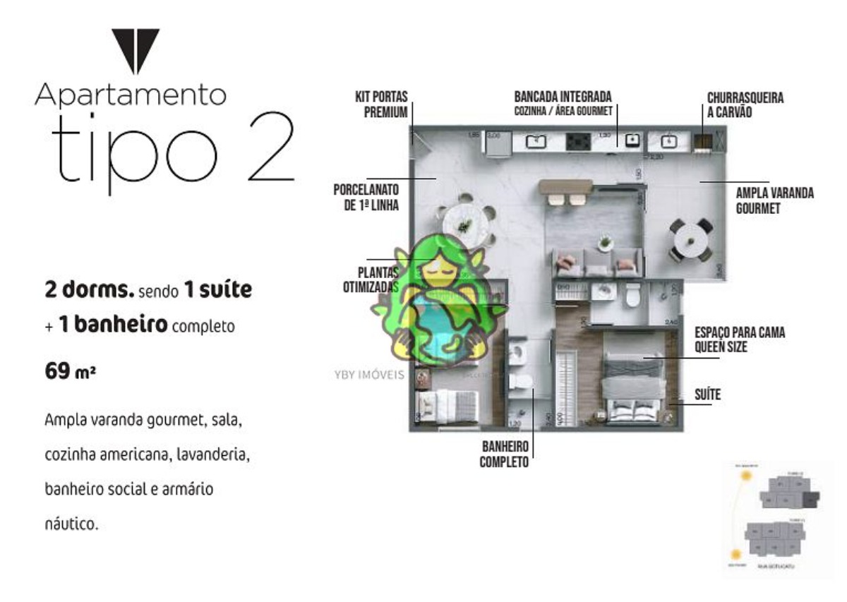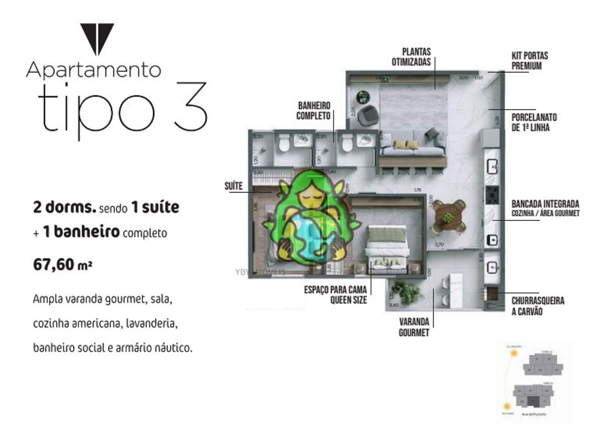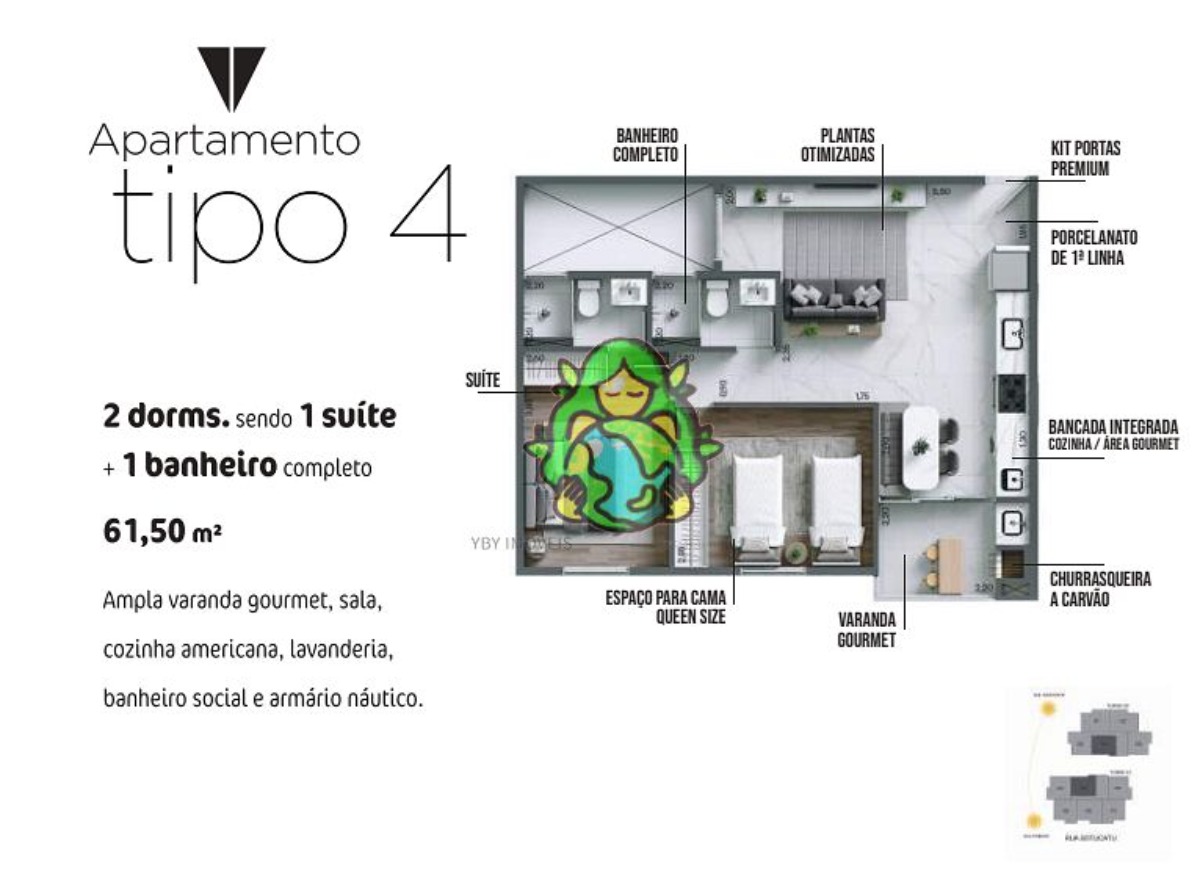 Com dois dormitórios, sendo uma suíte, banheiro social, uma ampla varanda gourmet, cozinha americana, lavanderia, uma vaga de garagem e armário náutico,