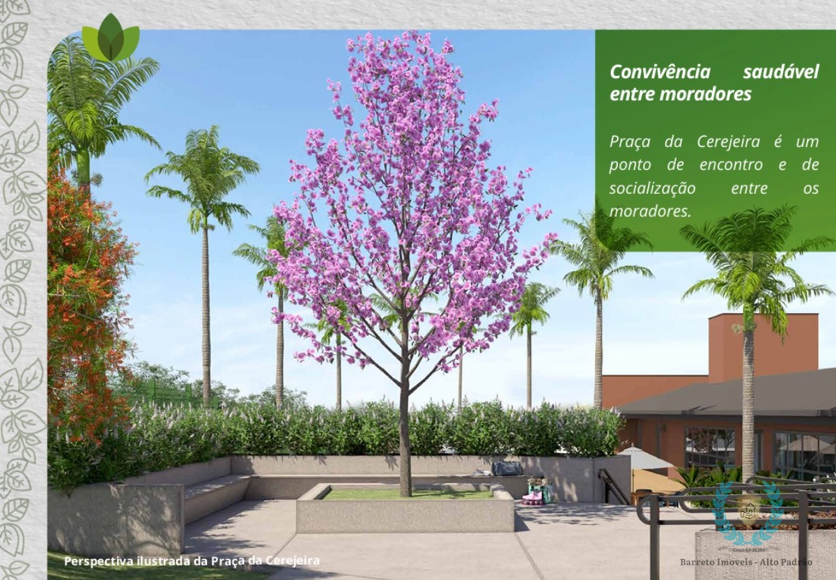 Portaria 24h com guarita de entrada e saída, Área administrativa para funcionários, Locker para correspondências e encomendas, Abrigo de resíduos, Espaço Piquenique, Espaço Luau, Horta, Piscinas, Estacionamento, Espaço Gourmet - Churrasqueira 1 e 2, Quadra Poliesportiva, Parquinho, Praça da Cerejeira, Academia Equipada, Sala de Jogos e Brinquedoteca, Vestiários Masculino e Feminino, Piscina Infantil com fontes interativas, Piscina Adulto.