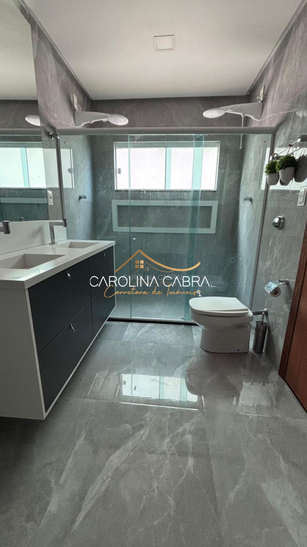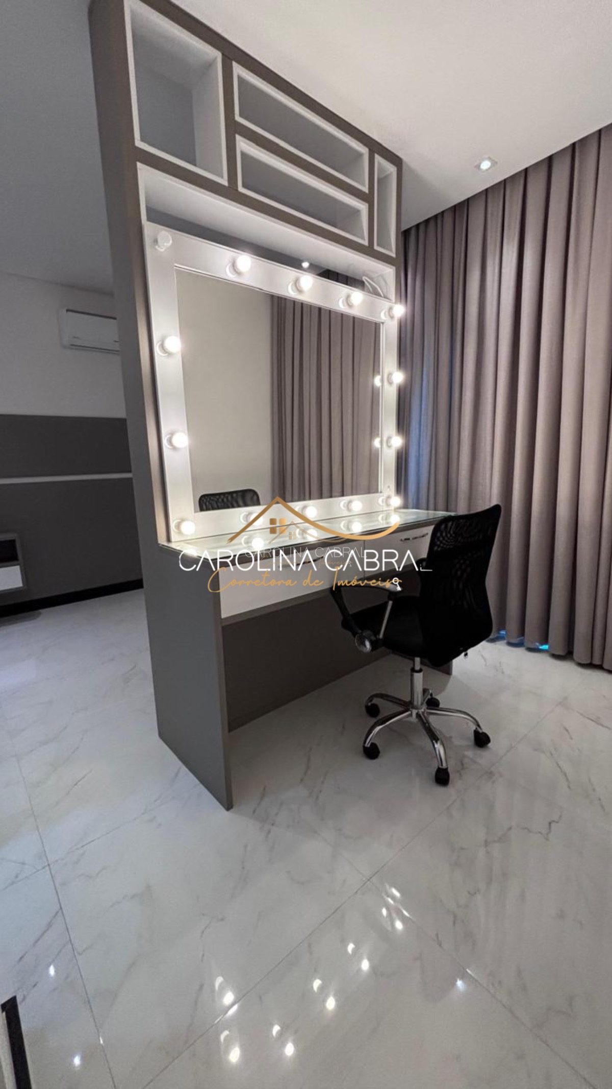 Suíte principal com varanda, closet e banheiro amplo (8m²), equipado com 2 pias, 2 chuveiros e instalações prontas para banheira (cortina Blackout)