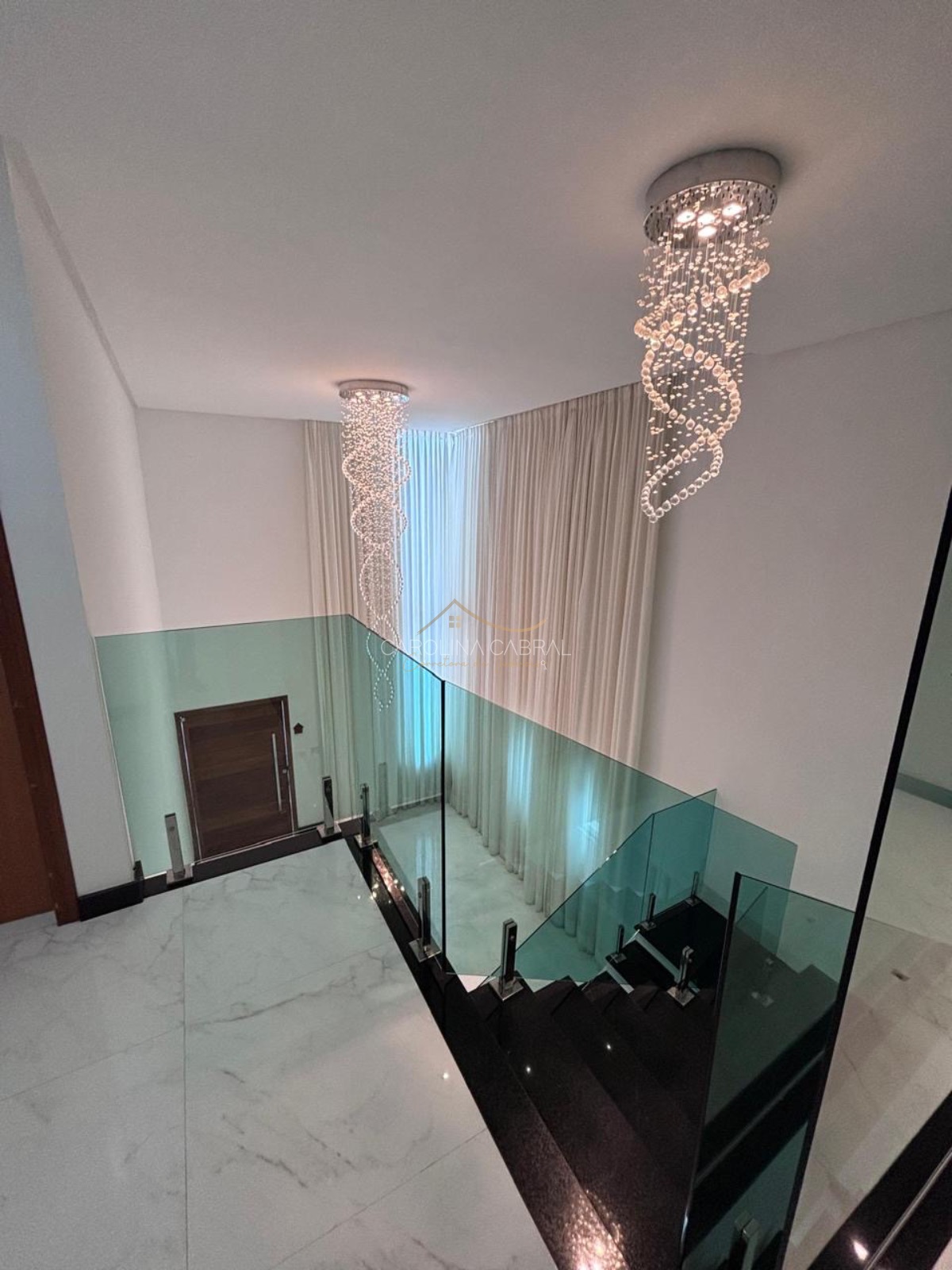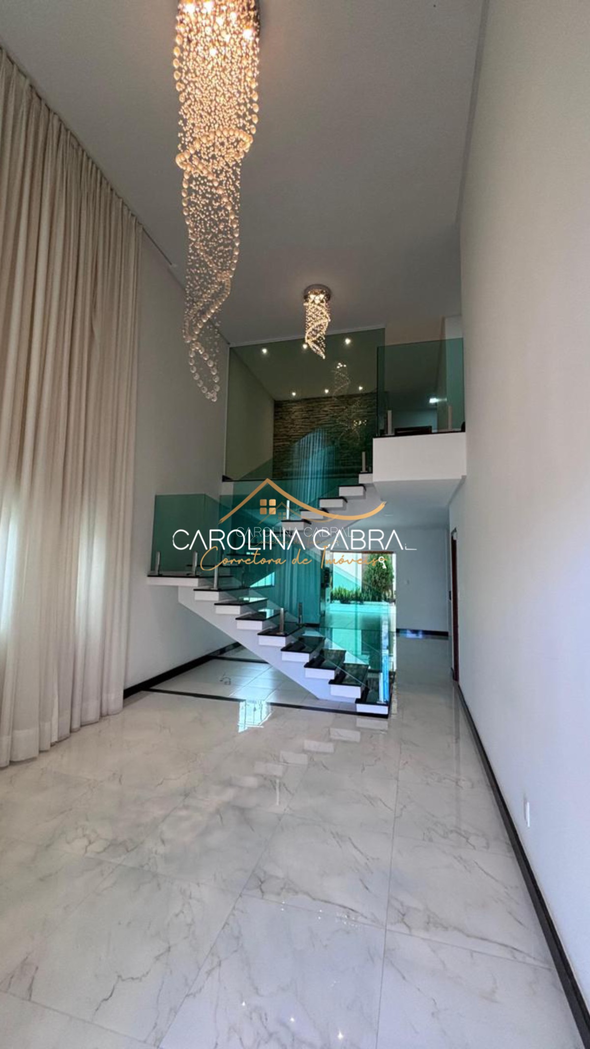 Sala de estar com pé direito duplo e cortina