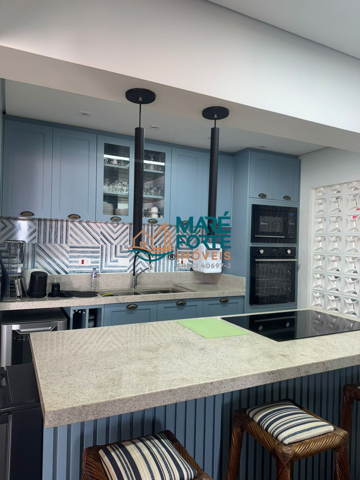 O apartamento é mobiliado e conta com armário de cozinha, despensa e uma cozinha bem equipada.