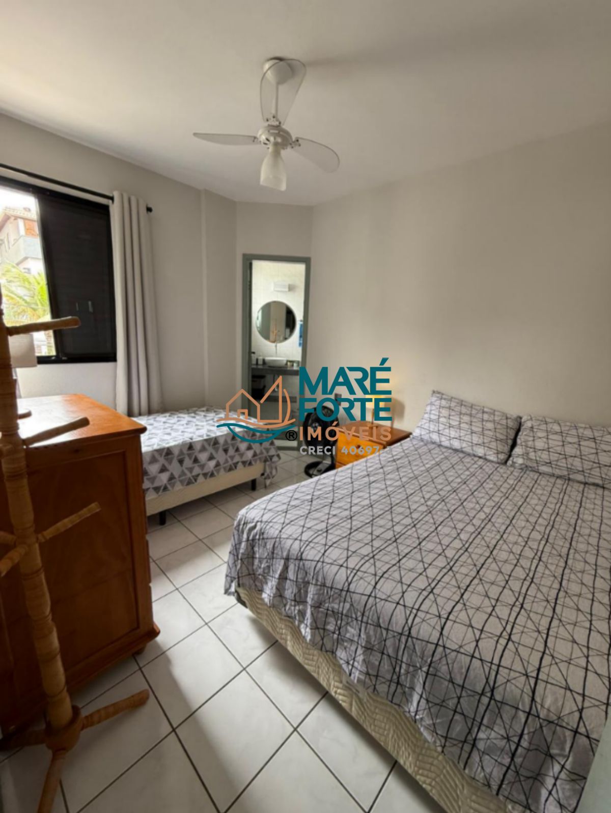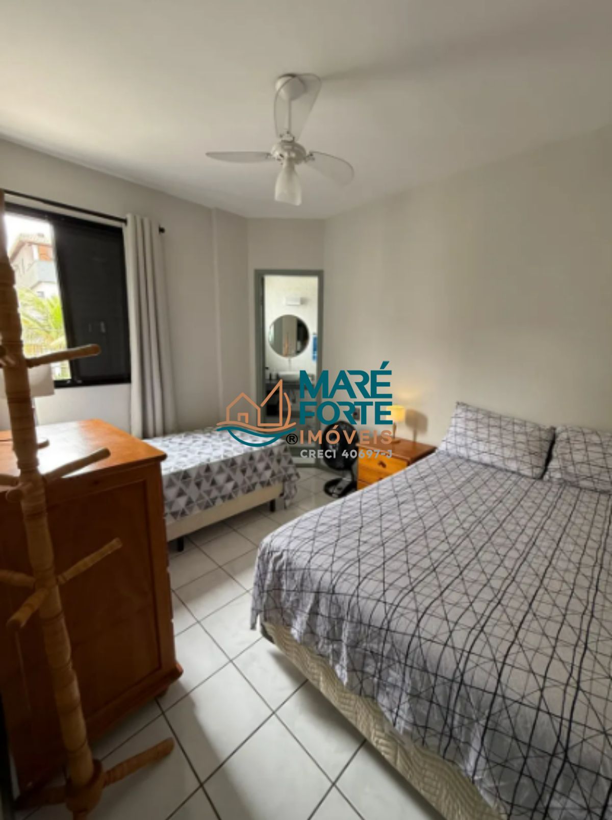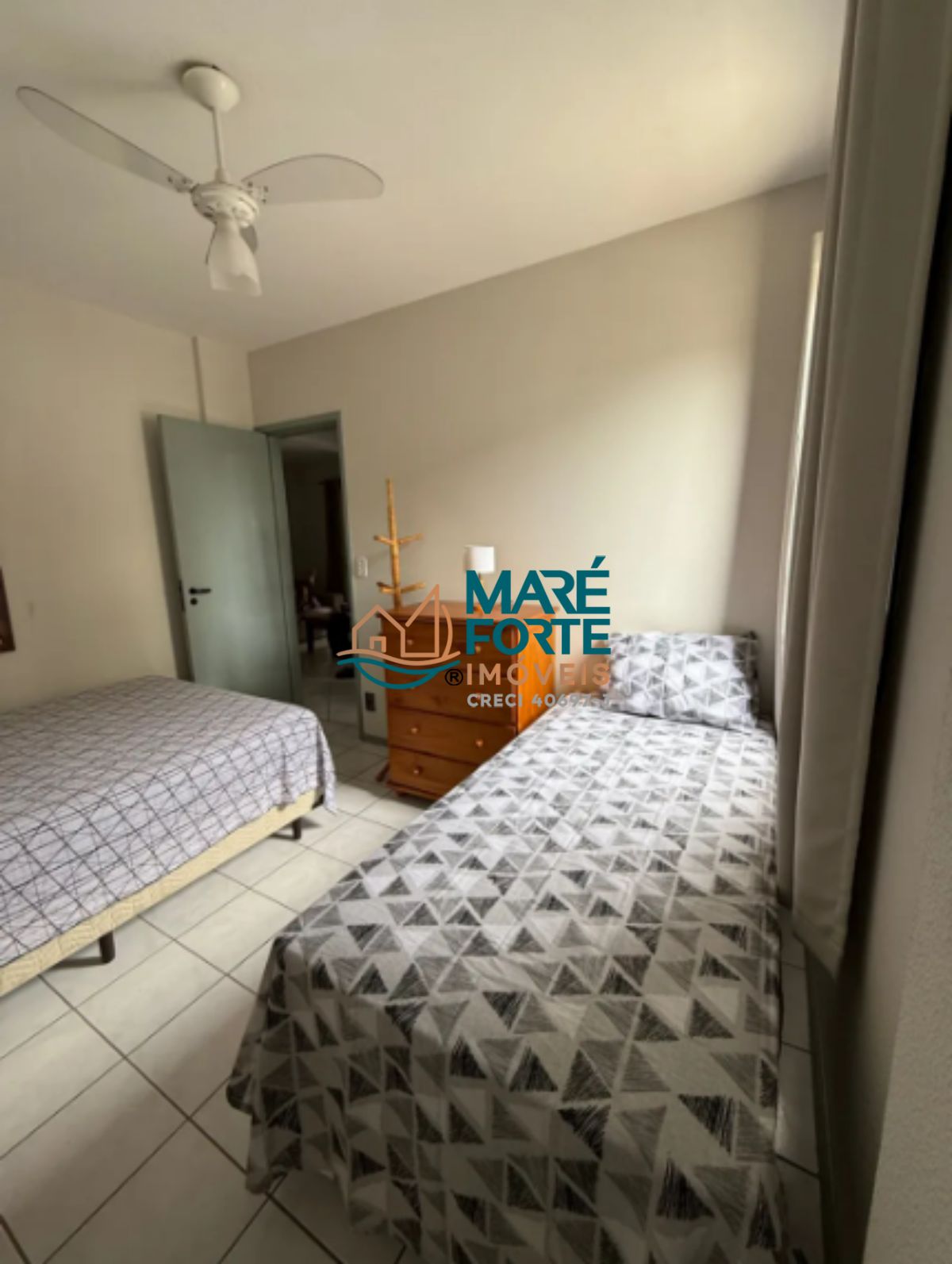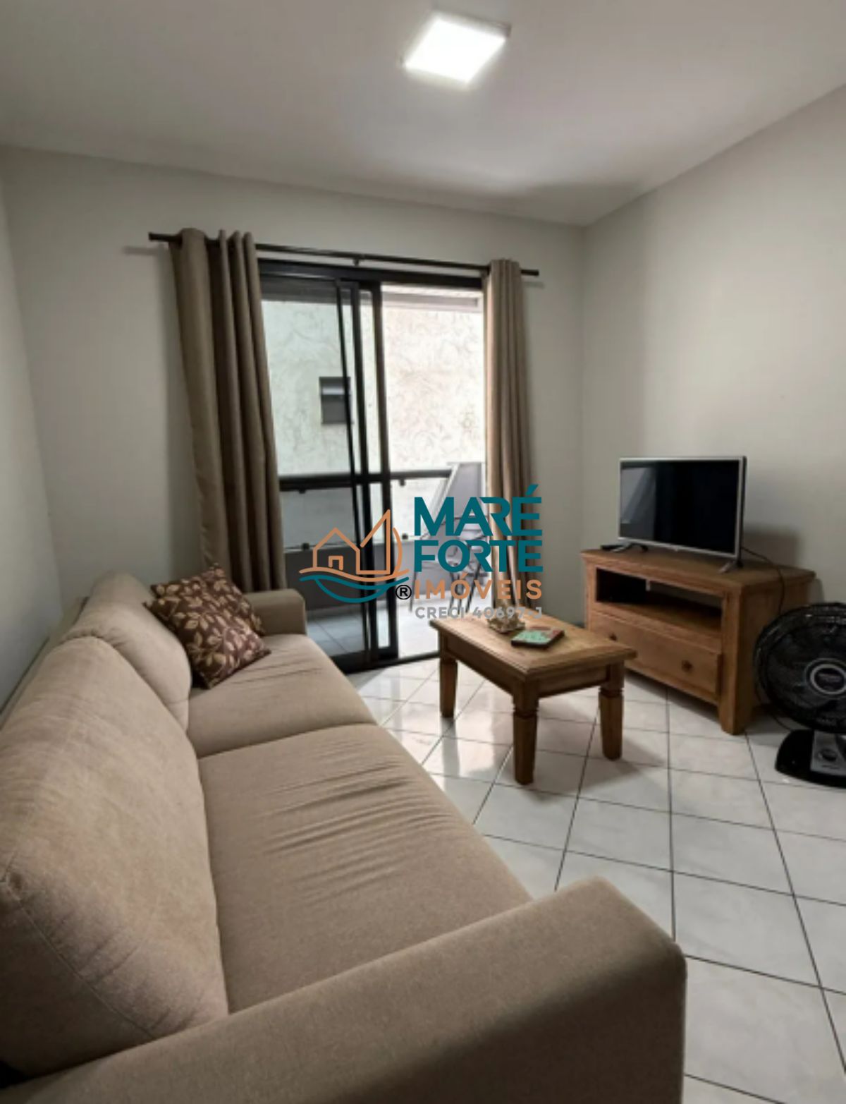 O apartamento é mobiliado e possui armário de cozinha, ventilador e uma cozinha funcional.