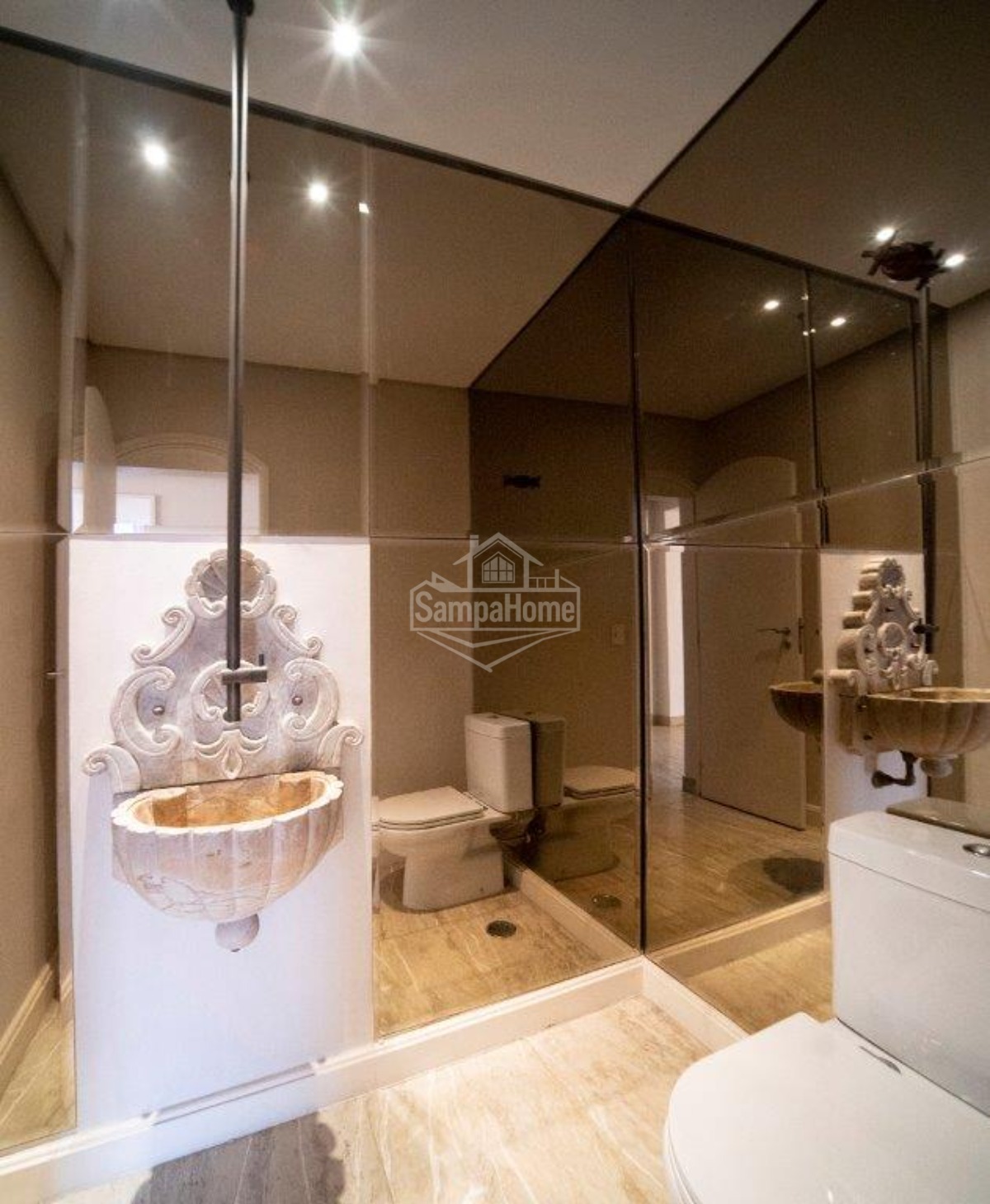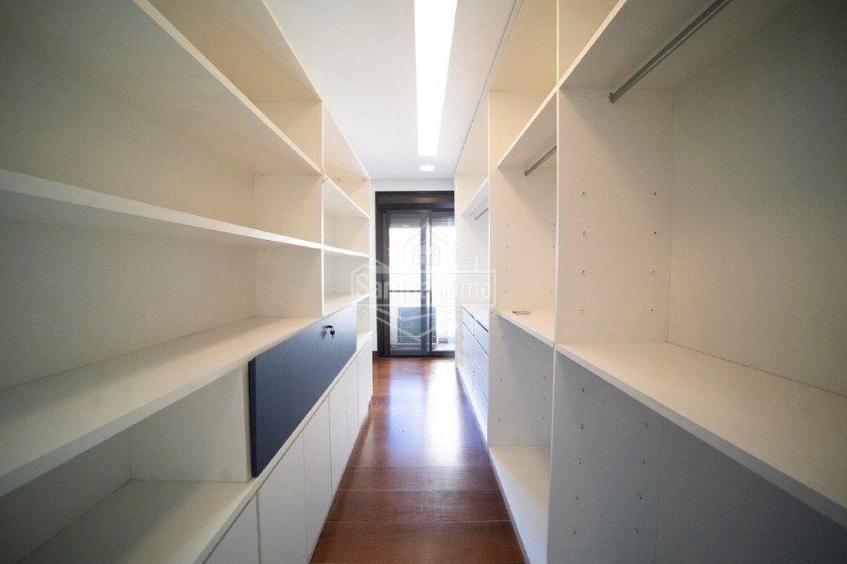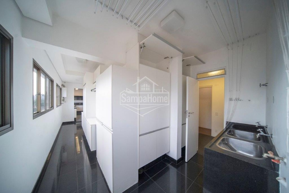 Lavabo, rouparia, hall social e hall privativo.
