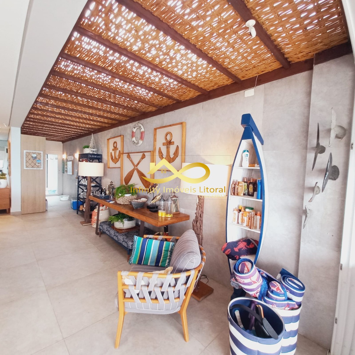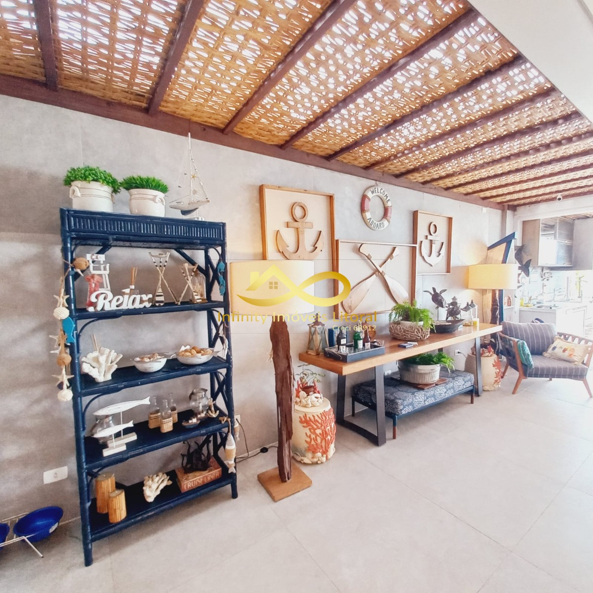 Área gourmet com uma bela mesa e uma churrasqueira de frente para o mar para vc curtir seus dias de lazer com sua família.