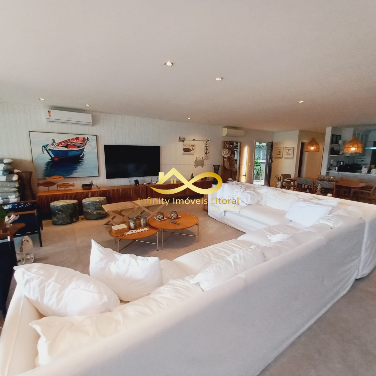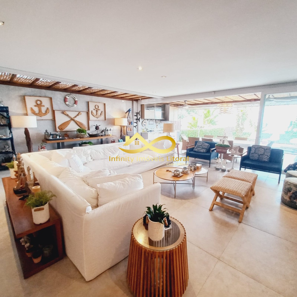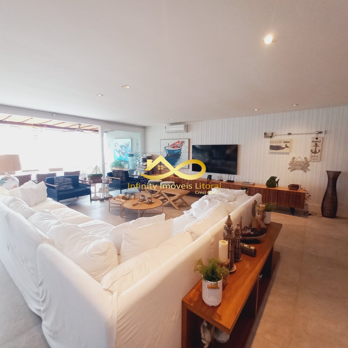 Casa decorada com elegância frente para o mar, sala de estar e jantar em ambiente aberto que se integra a área de lazer externa através de portas que se abrem por inteira.