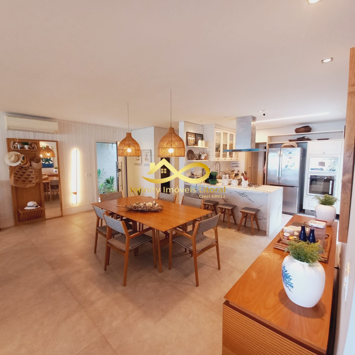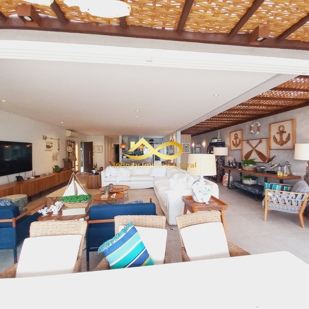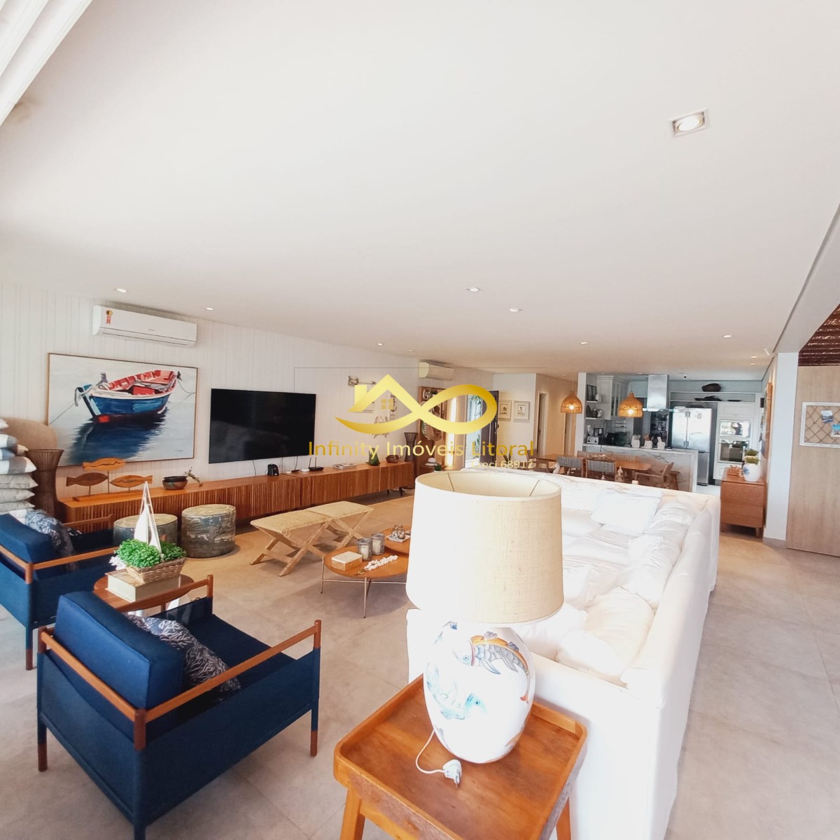 Casa decorada com elegância frente para o mar, sala de estar e jantar em ambiente aberto que se integra a área de lazer externa através de portas que se abrem por inteira.
