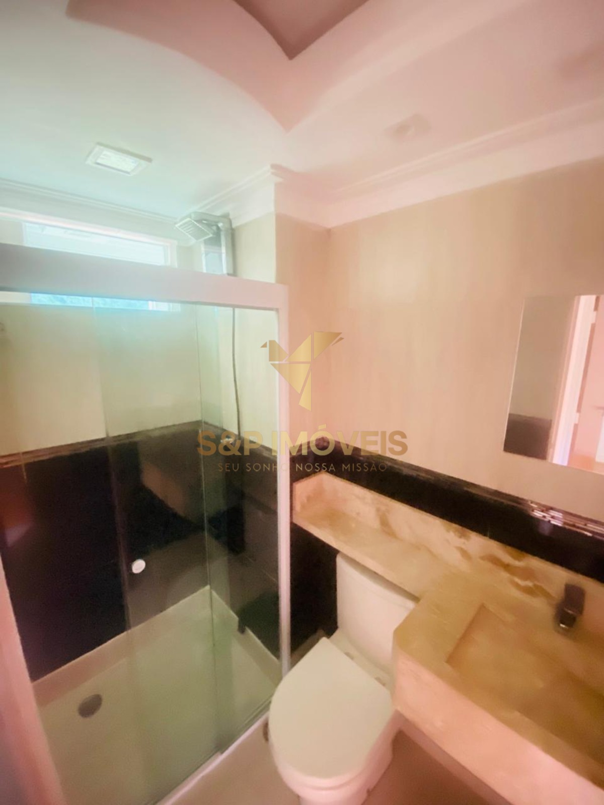 Banheiro moderno com pia em mármore travertino, porcelanato importado, sanca decorativa e box de vidro