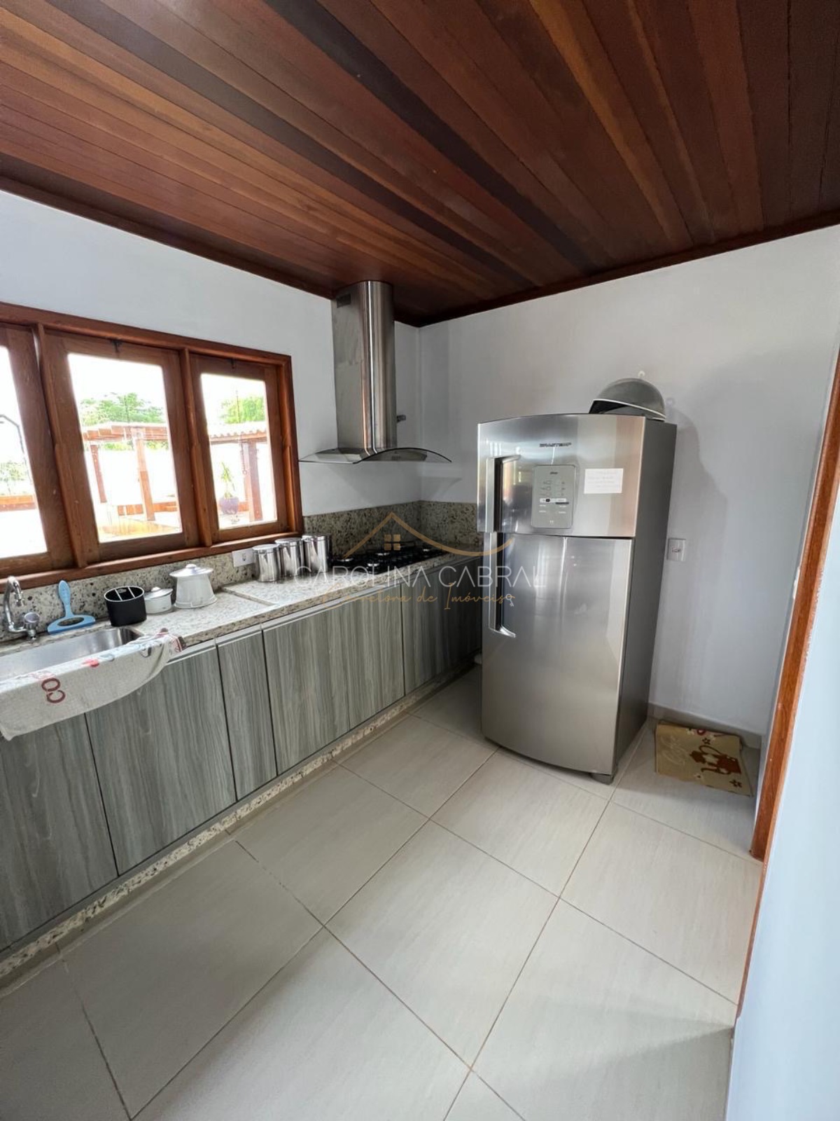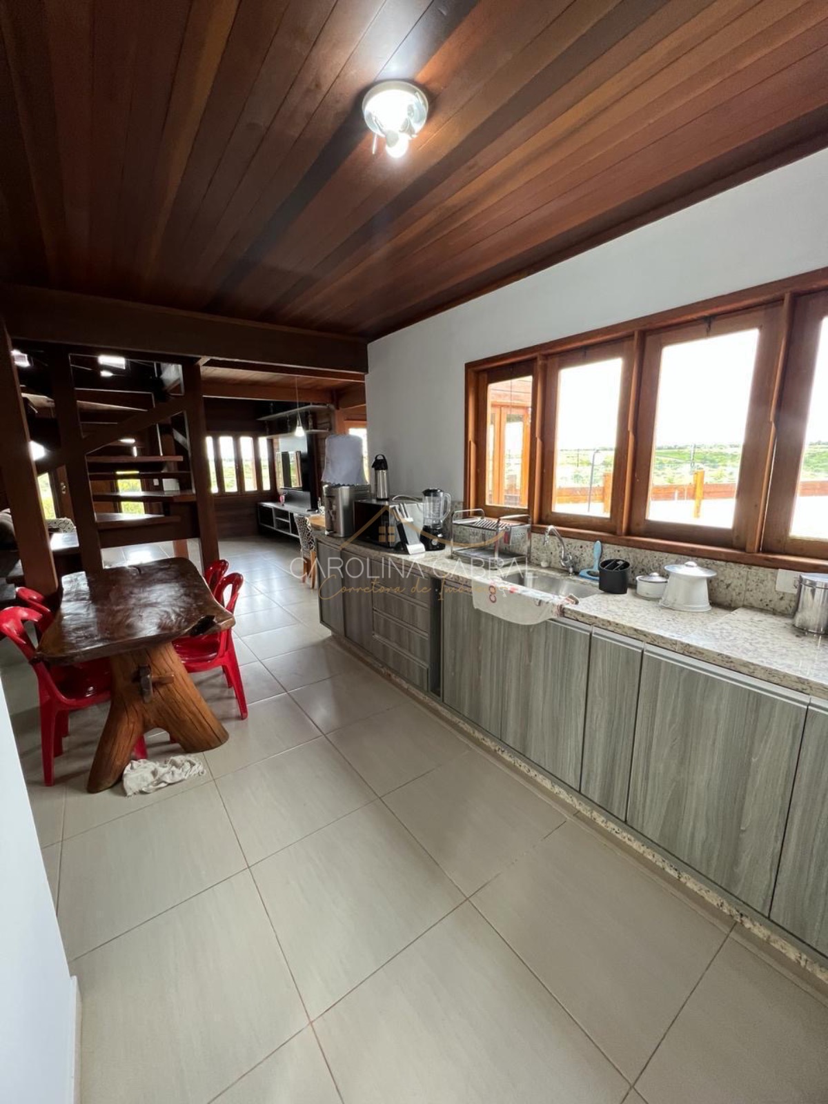 A sala de estar é um convite ao relaxamento, enquanto a cozinha, com espaço suficiente para refeições em família, se torna o coração da casa.