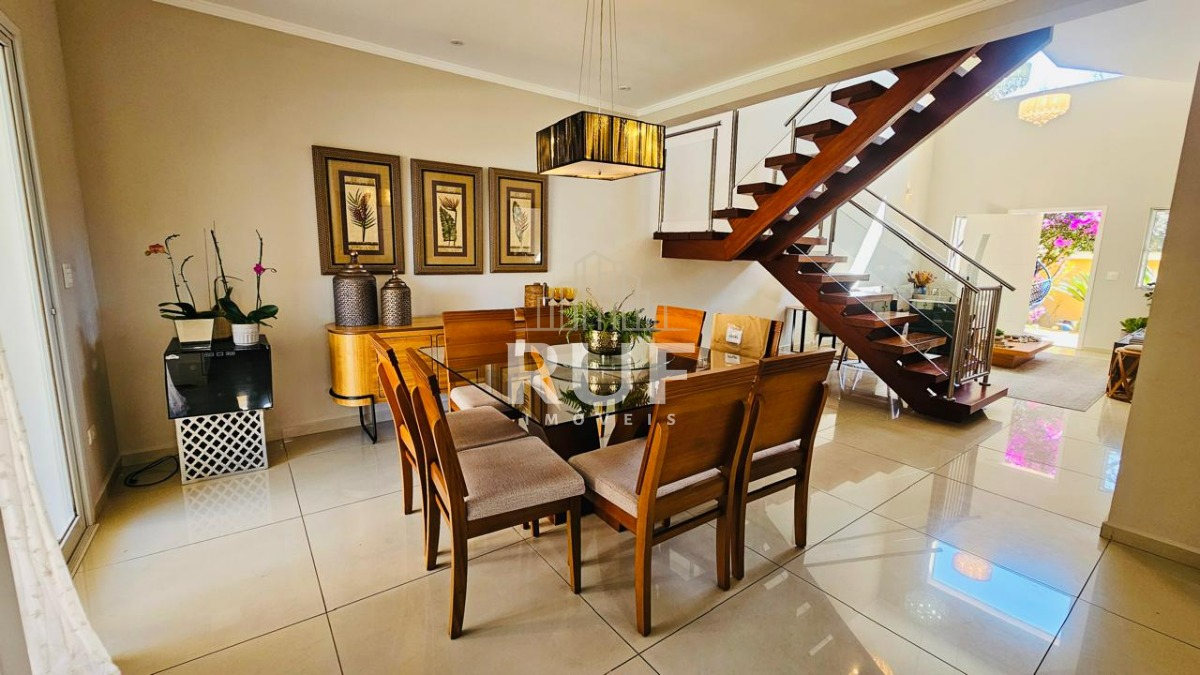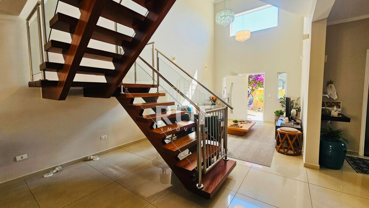 A cozinha estilo americana integra os ambientes com modernidade e praticidade, contando com armários planejados que oferecem funcionalidade e sofisticação. A escada em madeira maciça é um verdadeiro charme, trazendo calor e requinte ao lar.