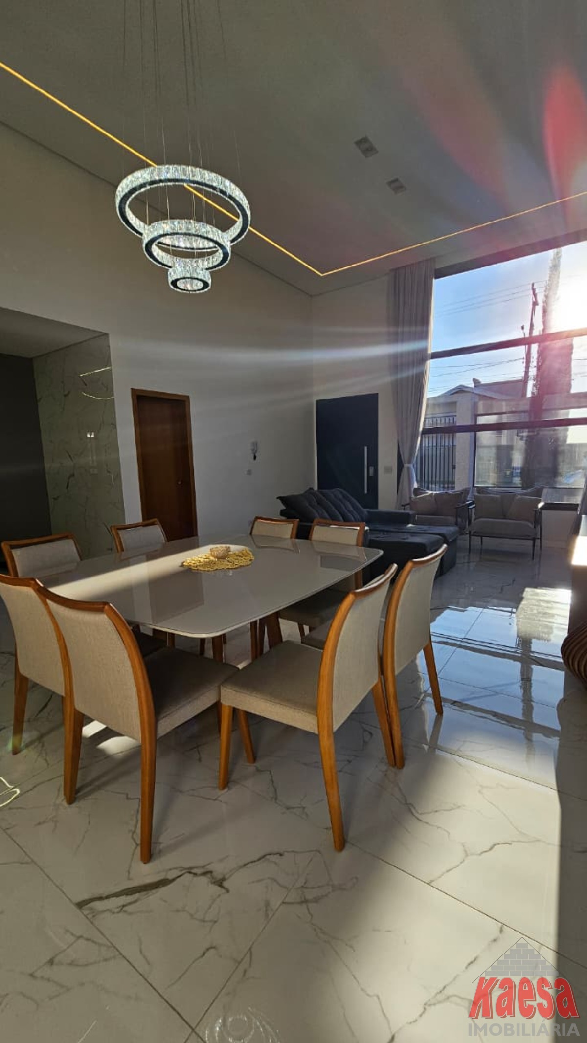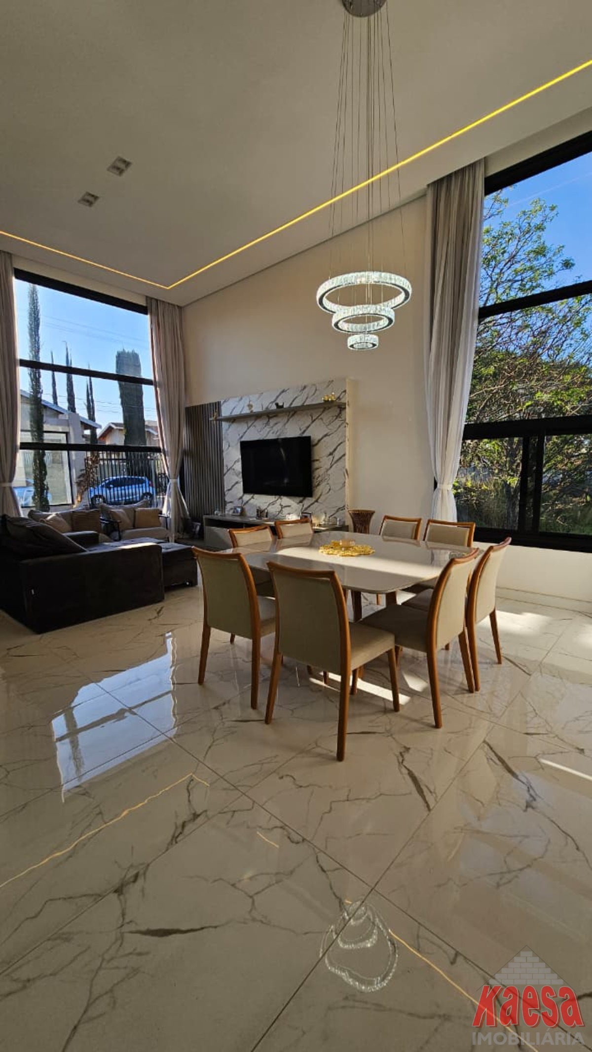 Sala 2 ambientes ampla com pé direito alto e cortinas automatizadas;