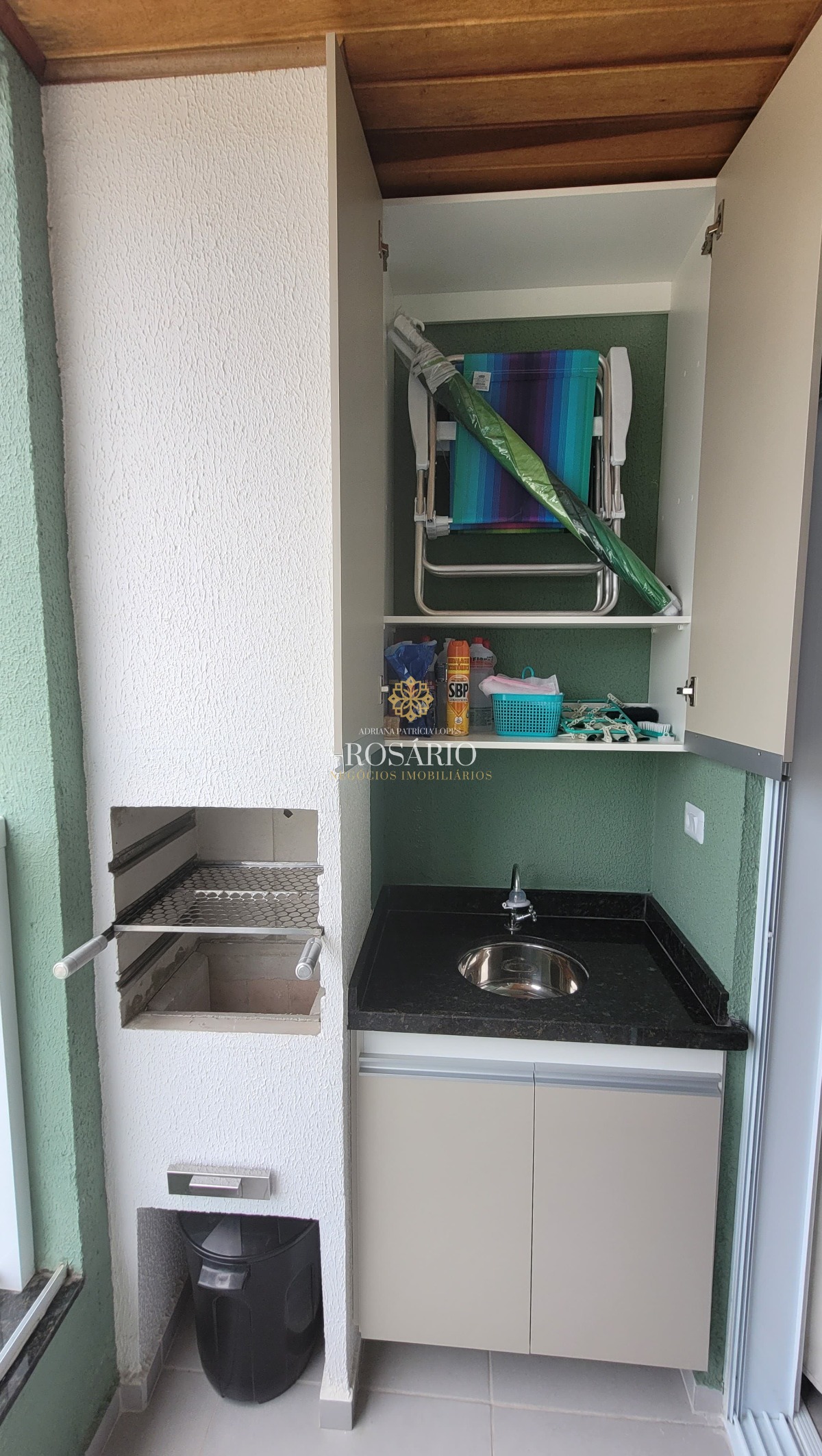 Na área gourmet integrada ao studio, churrasqueira, pia e armário para acomodar produtos de limpeza, cadeiras e guarda sóis de praia