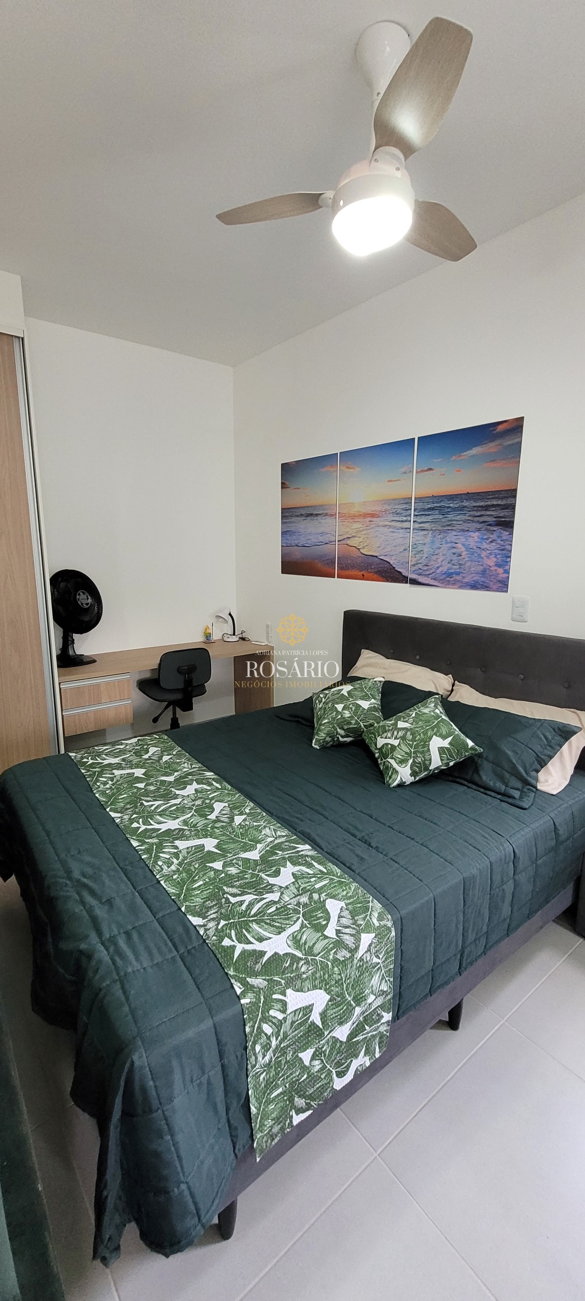 Piso em porcelanato, paredes com pintura impecável, ar condicionado e ventilador de teto, armários planejados.
