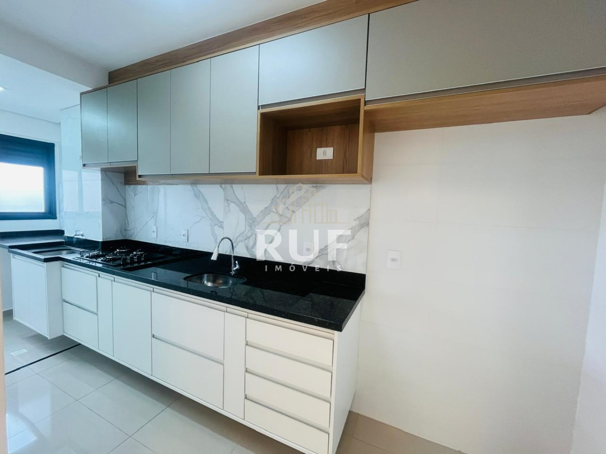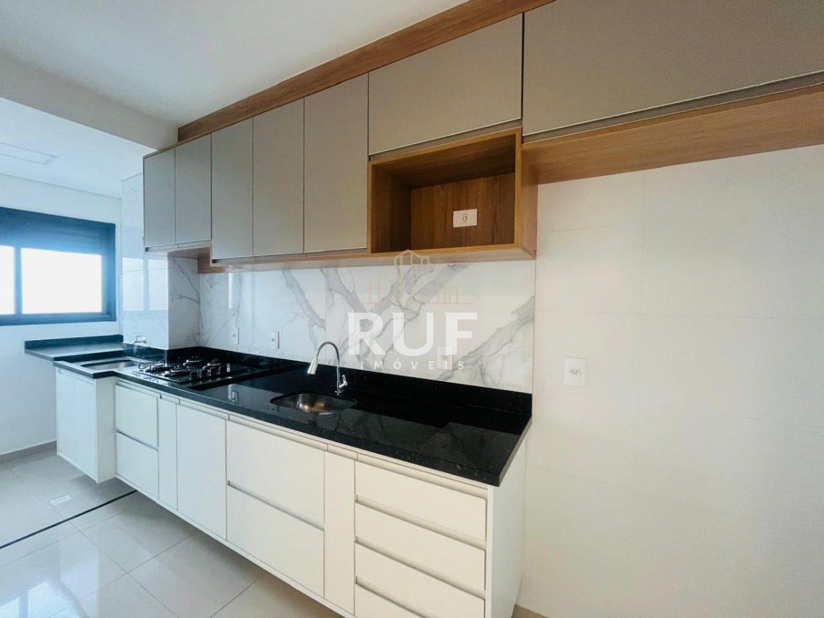 A cozinha planejada conta com pia em granito de 4,20m, cooktop embutido, revestimento marmorizado, torneira gourmet, armários planejados e espaço para geladeira side by side. A lavanderia mantém o mesmo padrão, com tanque em inox embutido na pedra.
