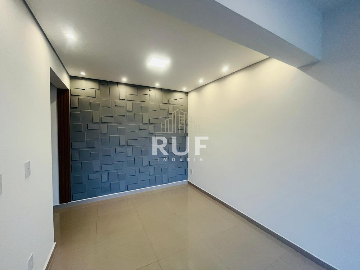 A sala para dois ambientes é ideal para momentos em família, com teto rebaixado em gesso, iluminação em LED, parede 3D e detalhe em ripado de madeira, criando um espaço moderno e acolhedor.