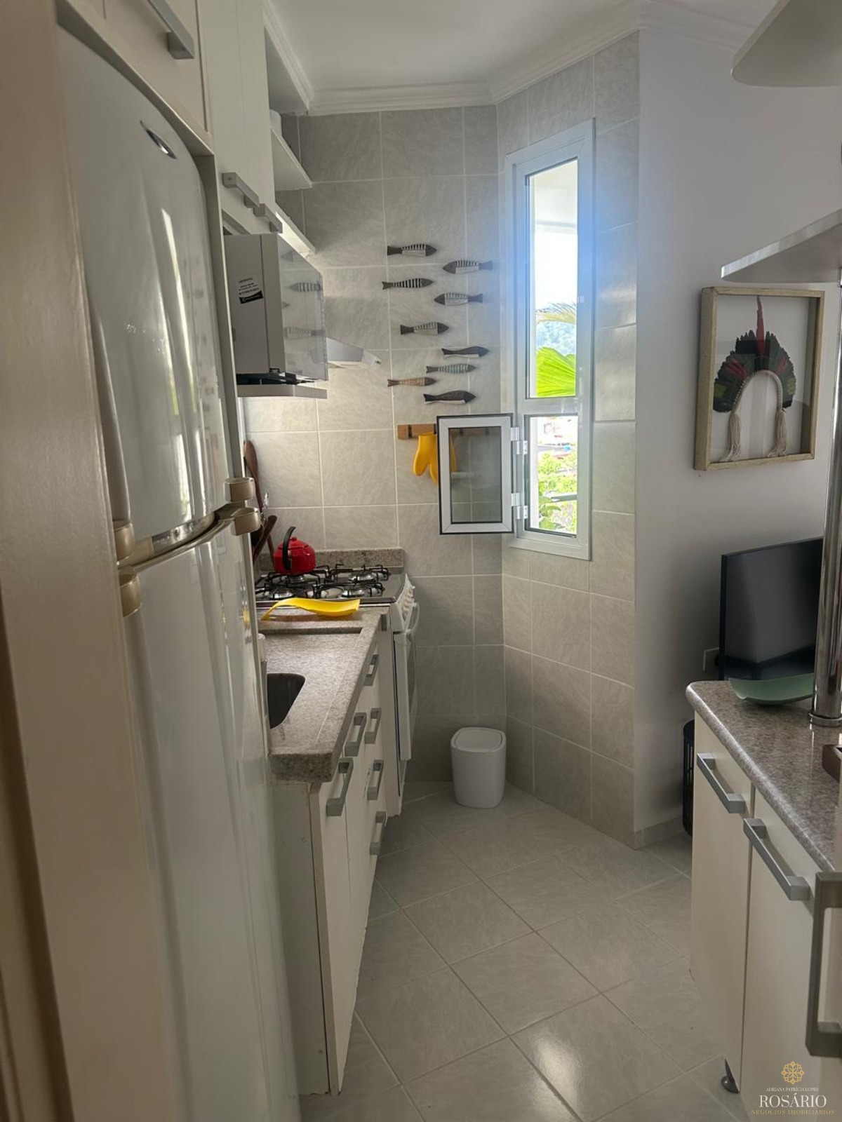 2 dormitórios, 1 banheiro, sala com sacada, cozinha com armários e área de serviço.