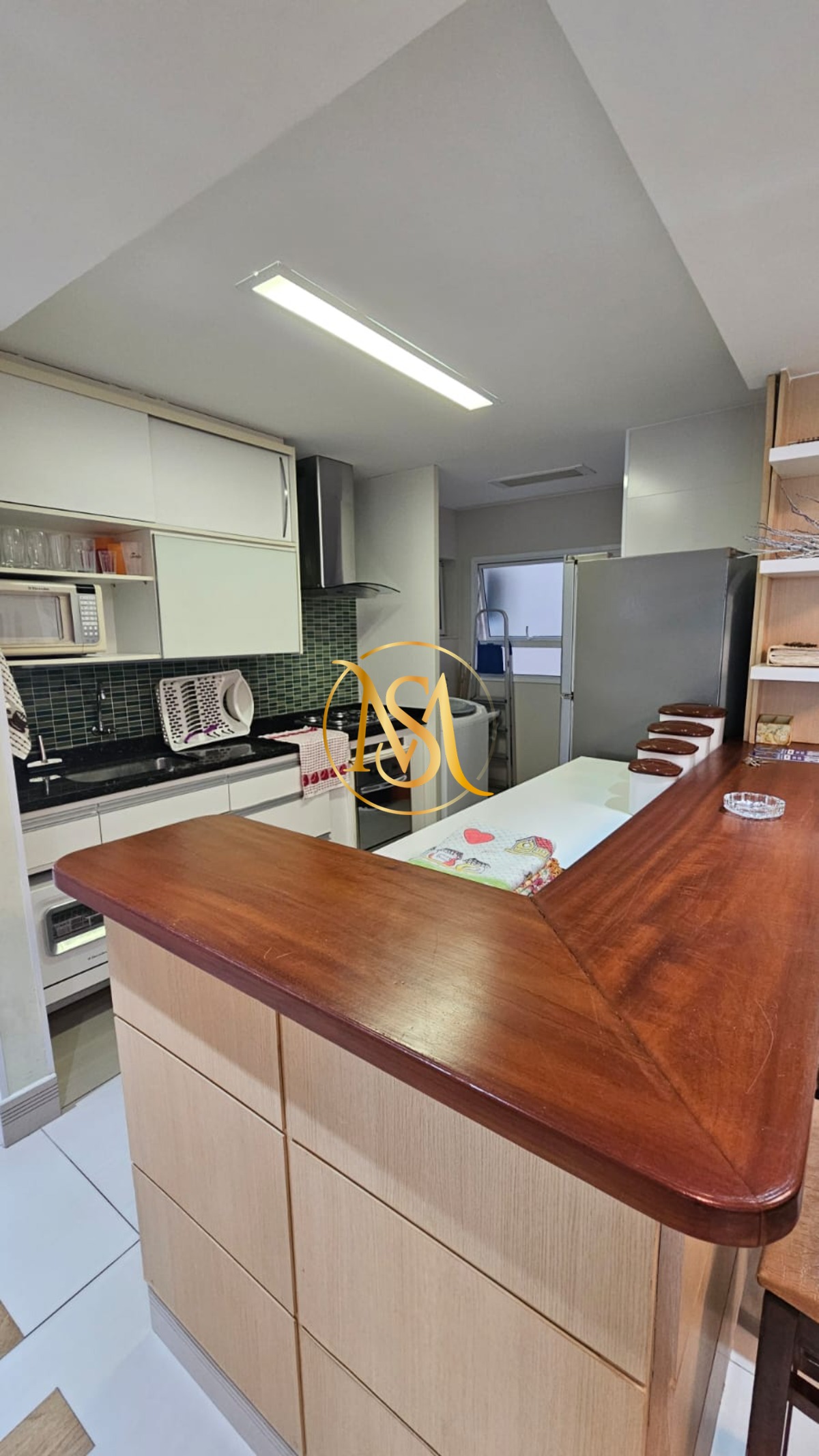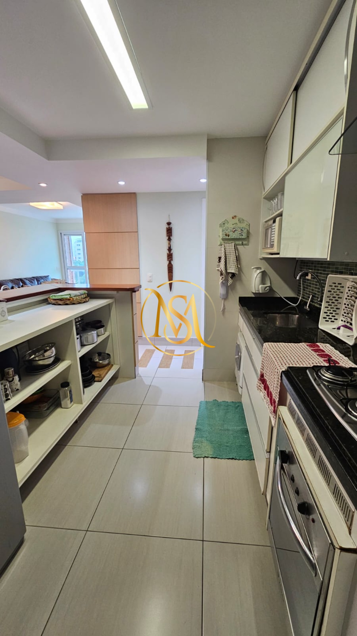 O apartamento é mobiliado e possui armários de cozinha e embutidos, proporcionando organização e funcionalidade.