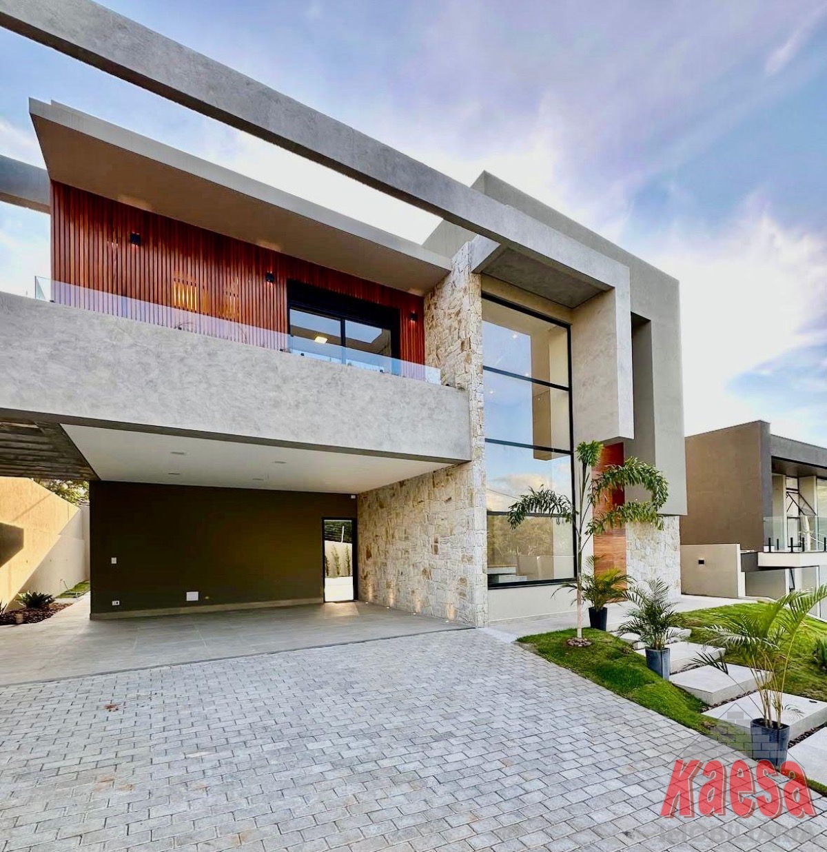 Acabamento premium, combinando pedras naturais e madeira.
