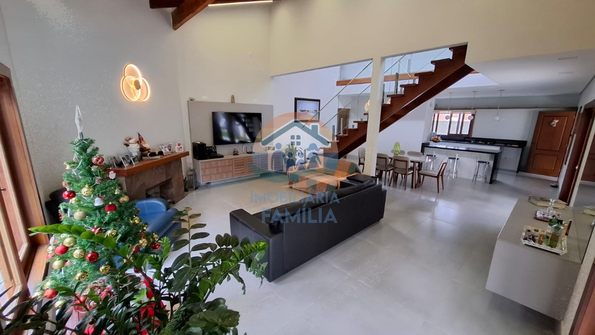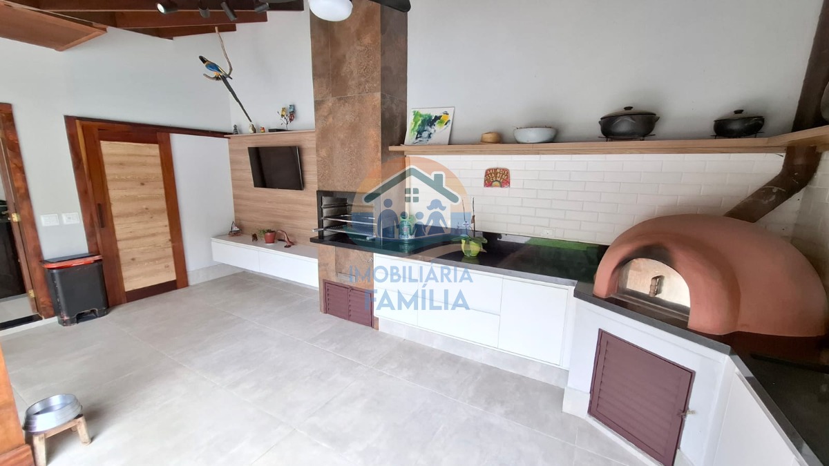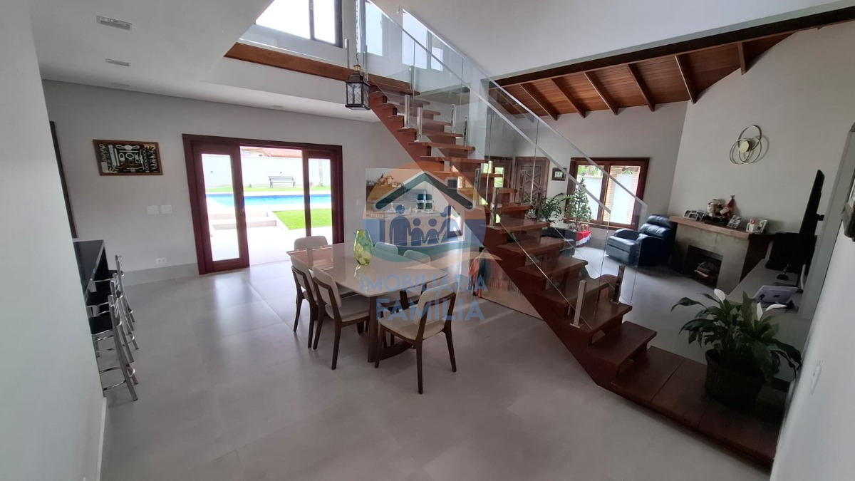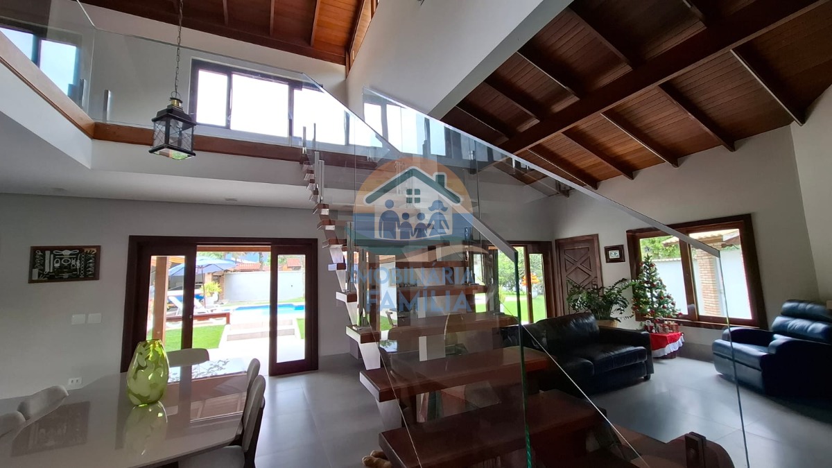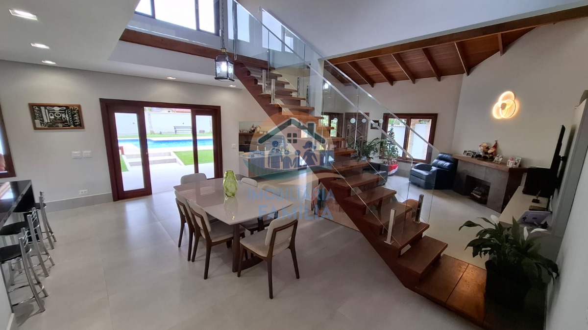 Contando com 3 dormitórios amplos (3 suítes), sacada, sala de estar e jantar amplas com conceito aberto e pé direito duplo, lareira, cozinha completa, área de serviços, lavabo, amplo quintal para 7 vagas de garagem, depósito, banheiro social, área gourmet completa com churrasqueira à carvão e forno à lenha, além de uma maravilhosa piscina com cascata e hidromassagem.