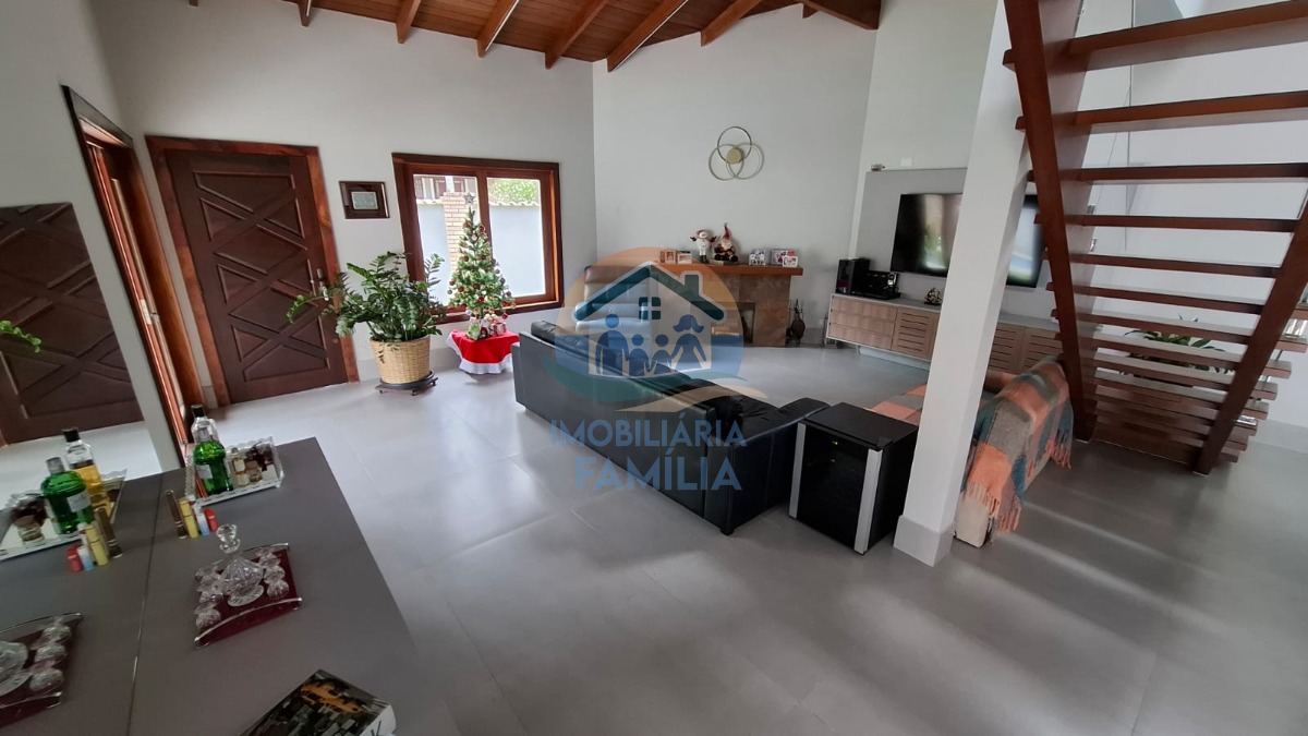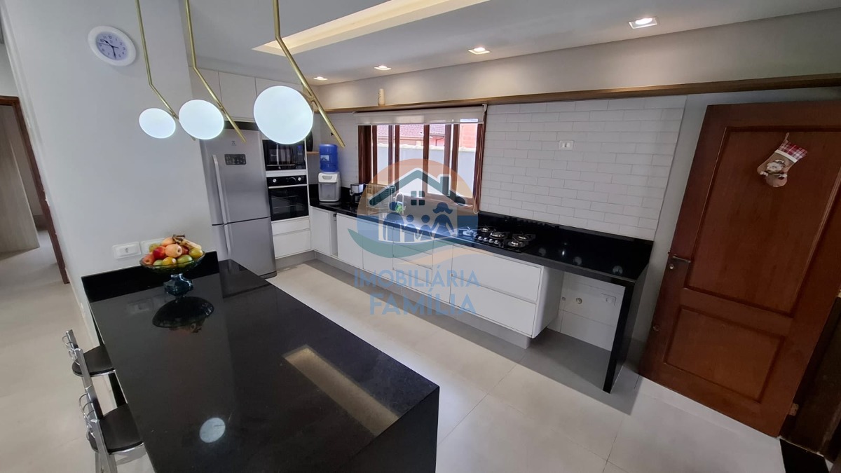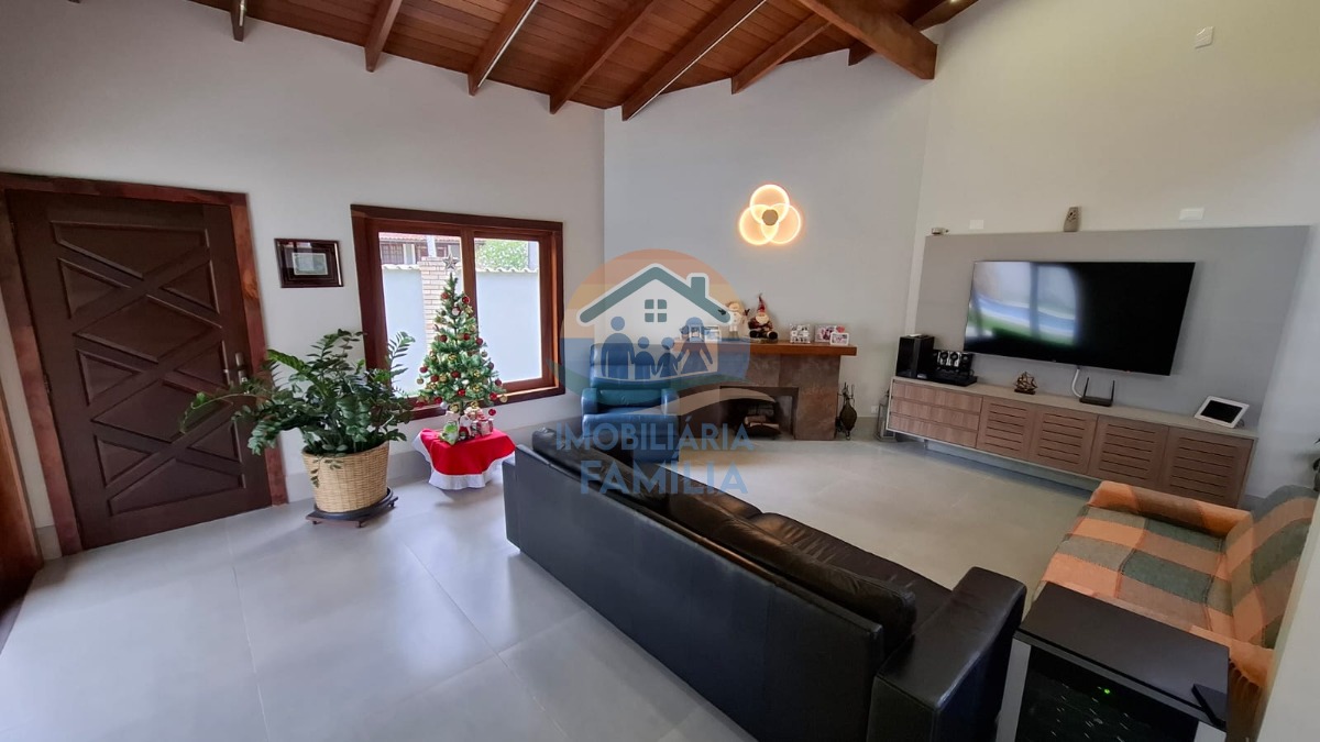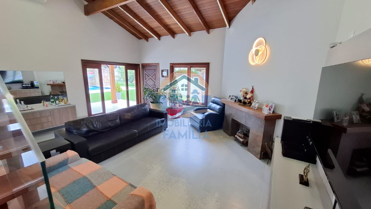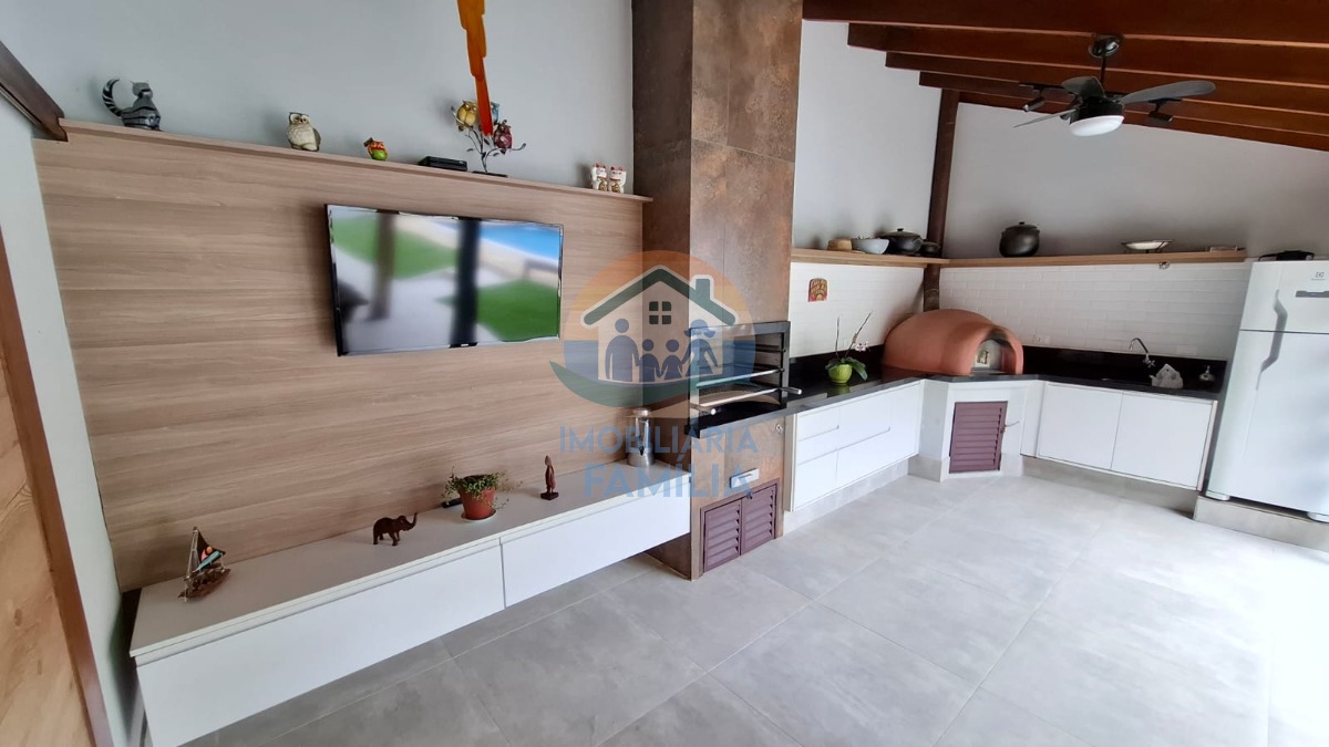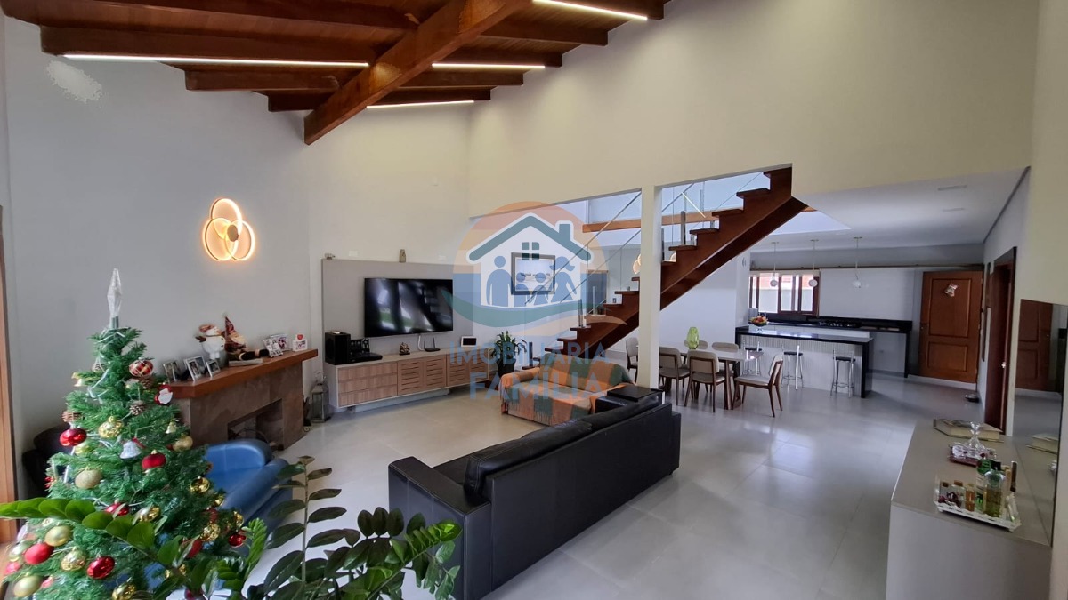 Contando com 3 dormitórios amplos (3 suítes), sacada, sala de estar e jantar amplas com conceito aberto e pé direito duplo, lareira, cozinha completa, área de serviços, lavabo, amplo quintal para 7 vagas de garagem, depósito, banheiro social, área gourmet completa com churrasqueira à carvão e forno à lenha, além de uma maravilhosa piscina com cascata e hidromassagem.
