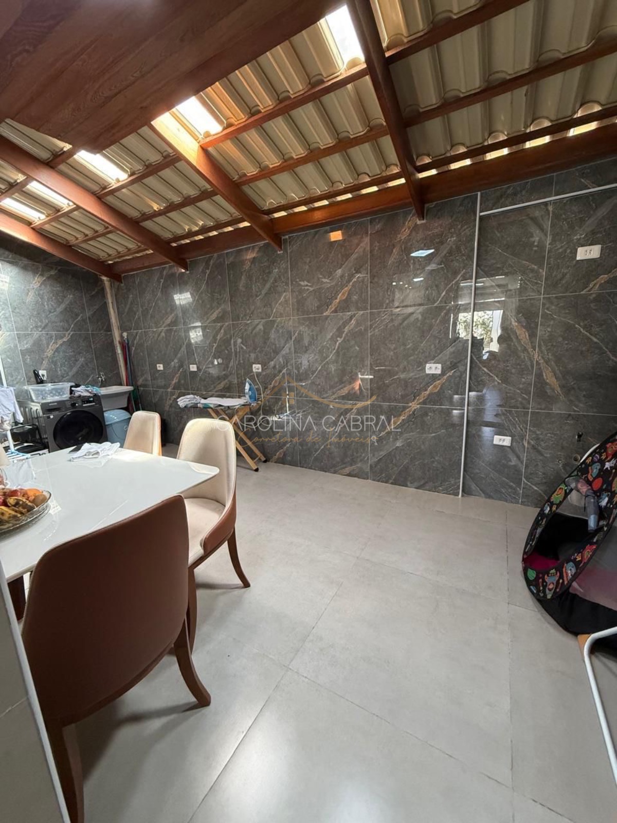 Quintal reformado com piso e cobertura.