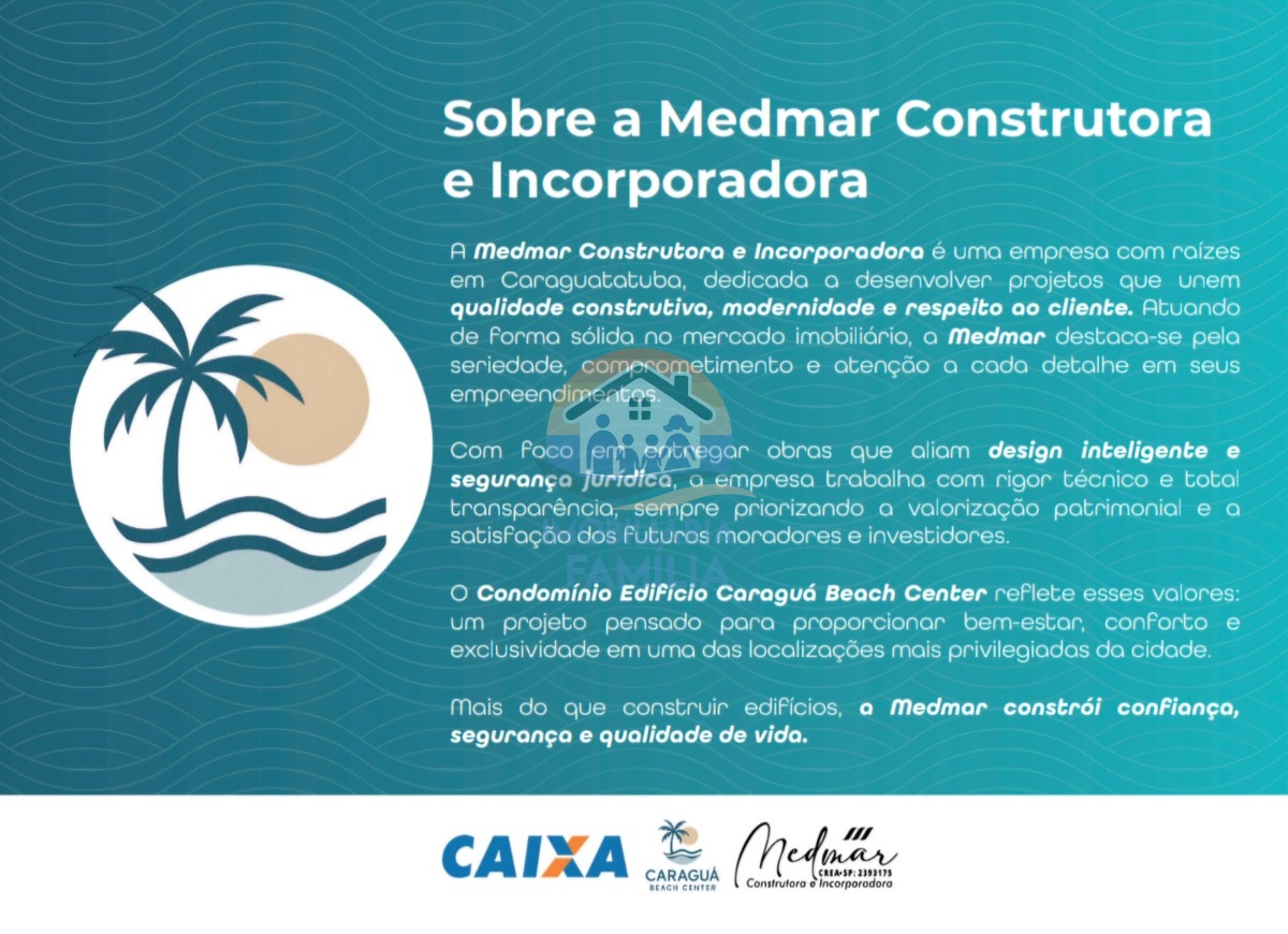 Situado no centro da cidade, morar no Caraguá Beach Center é ter tudo ao seu redor: Praias, comércio, serviços, gastronomia e lazer no coração de Caraguatatuba. Uma localização central e estratégica que garante praticidade no dia a dia e alta valorização para o seu investimento.