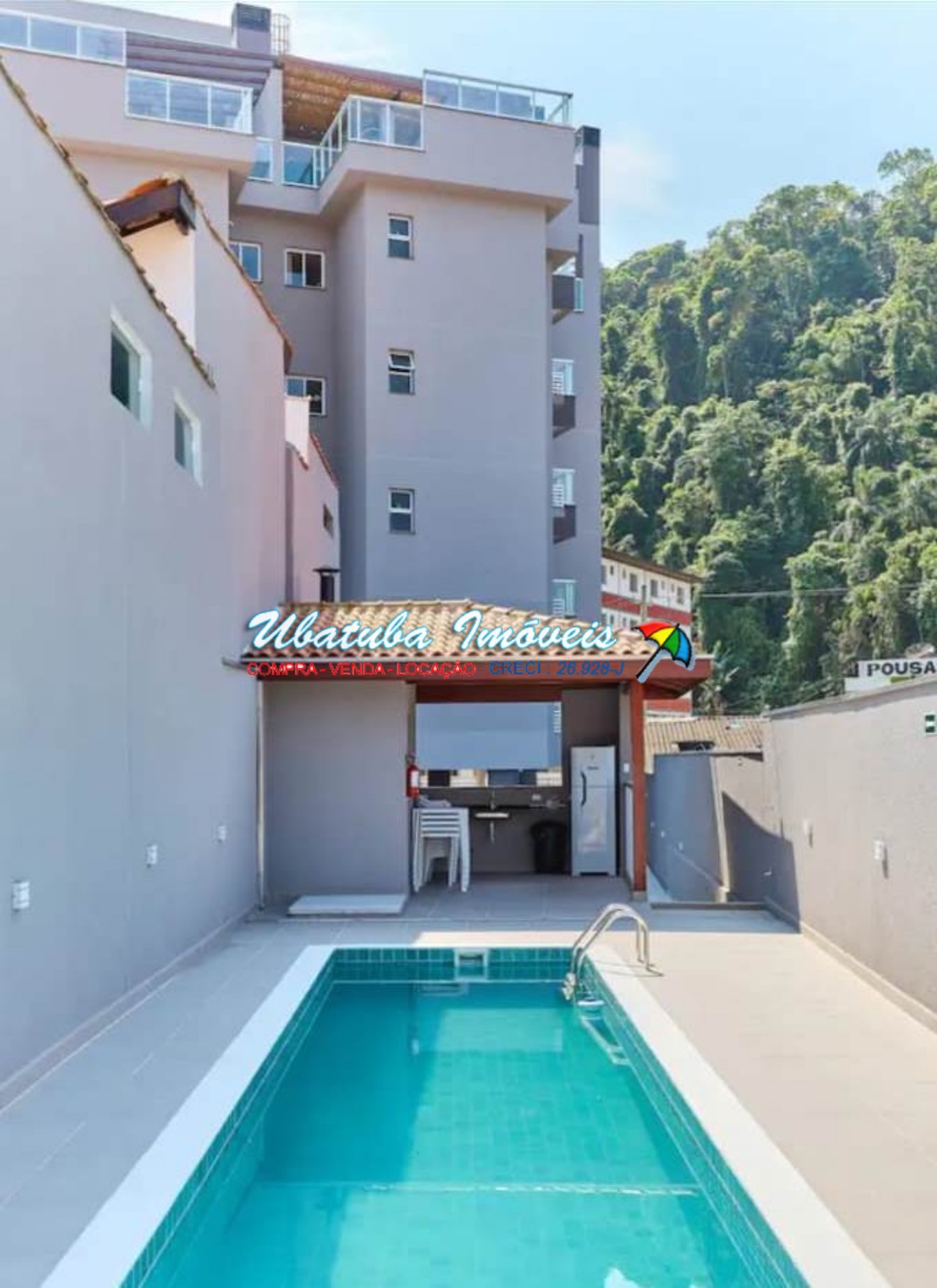 A piscina é um convite ao relaxamento e ao lazer, perfeita para os dias ensolarados.