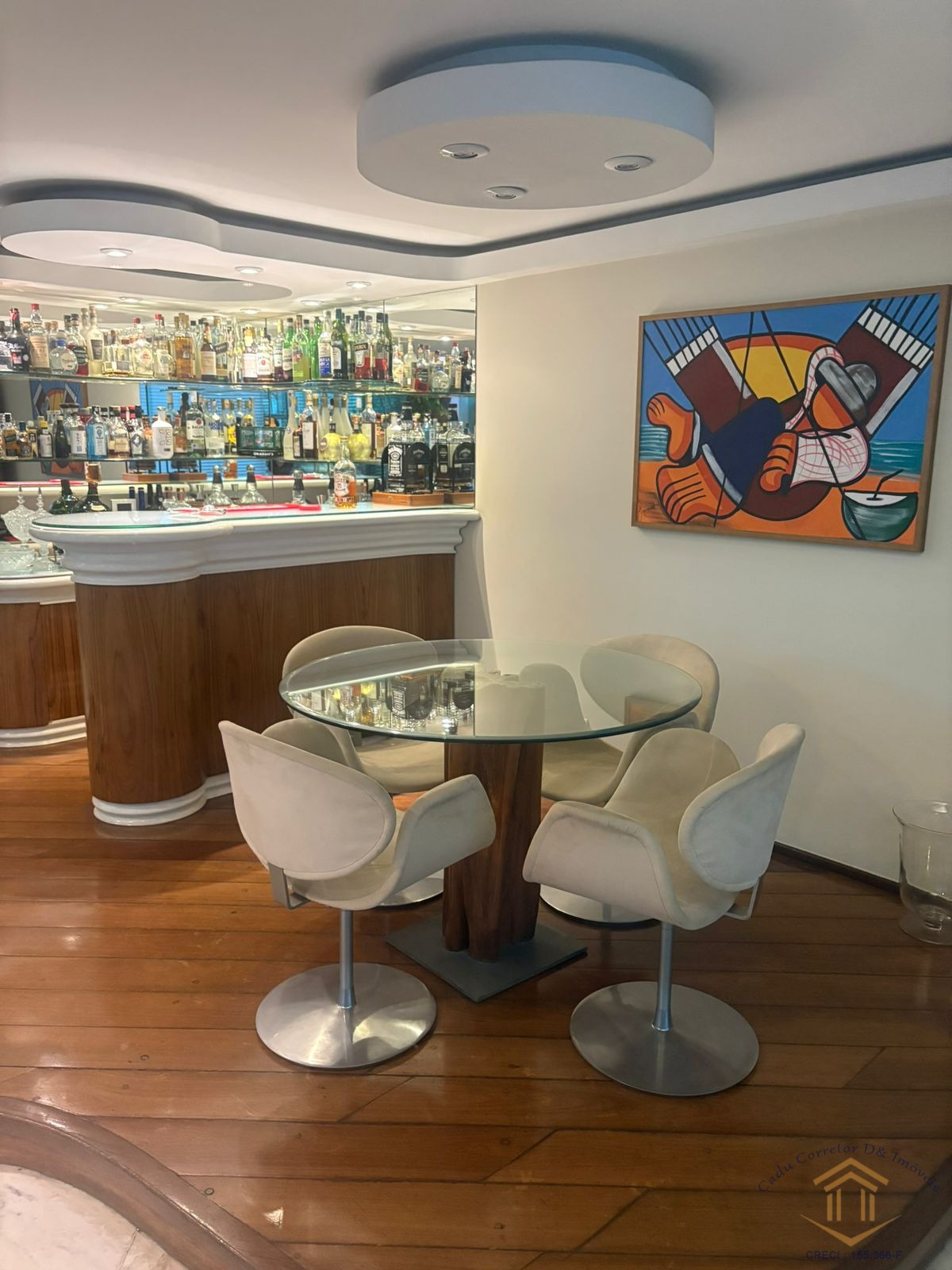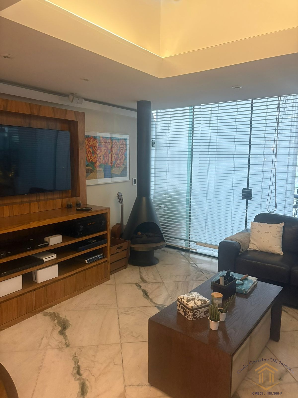 Sala de estar com bar, lareira e claraboia, Banheiro de apoio.
