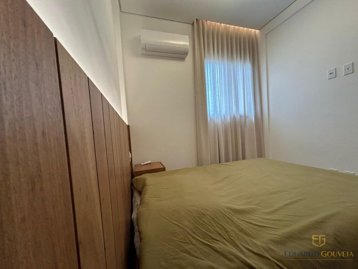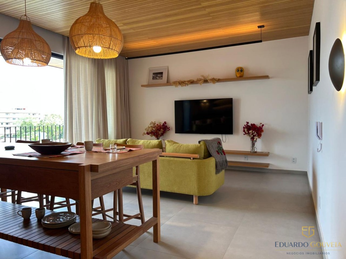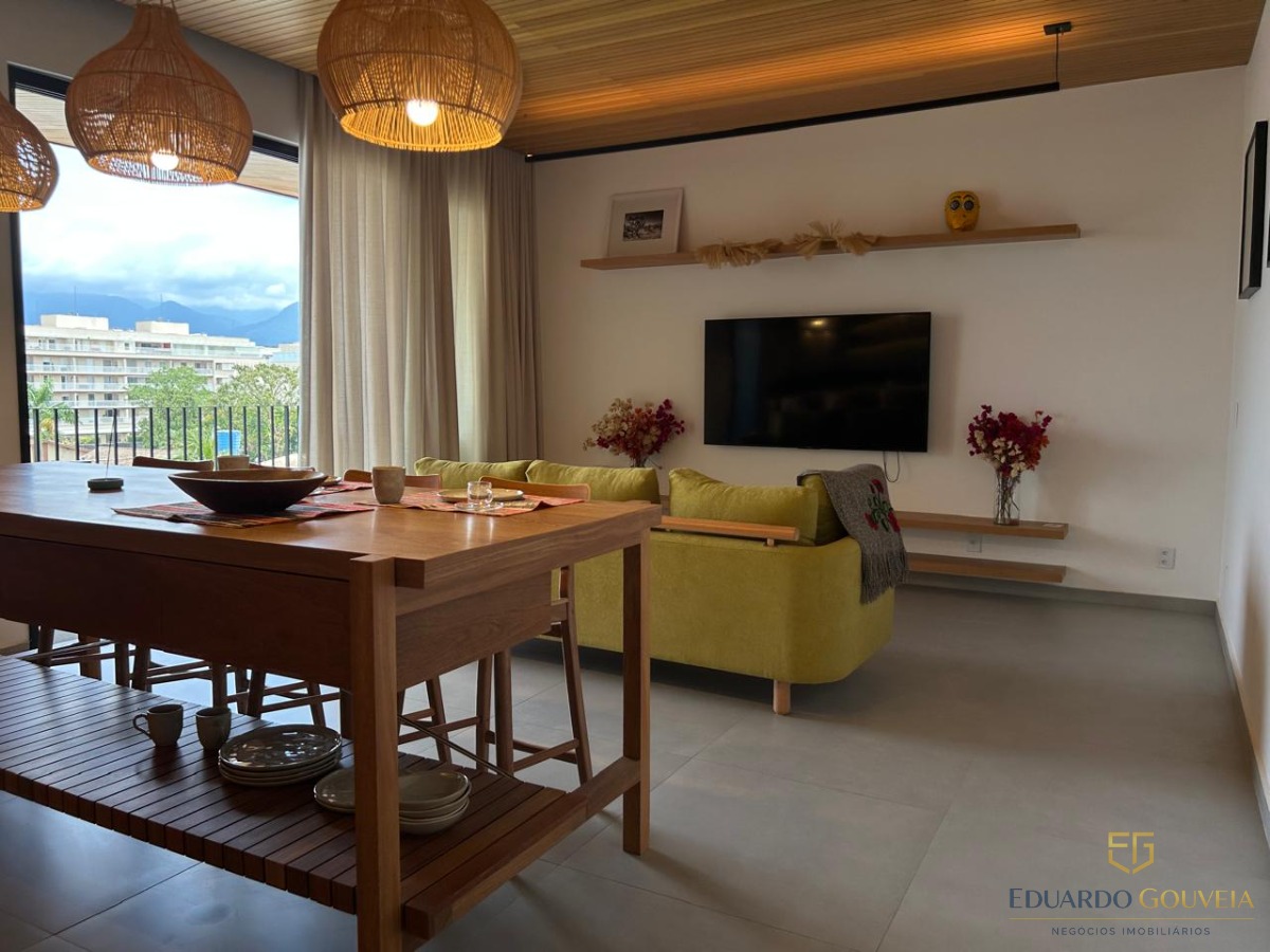 Apartamento novo, totalmente mobiliado, com 92 m², localizado no 3º andar, oferecendo uma vista privilegiada para o mar e a montanha.