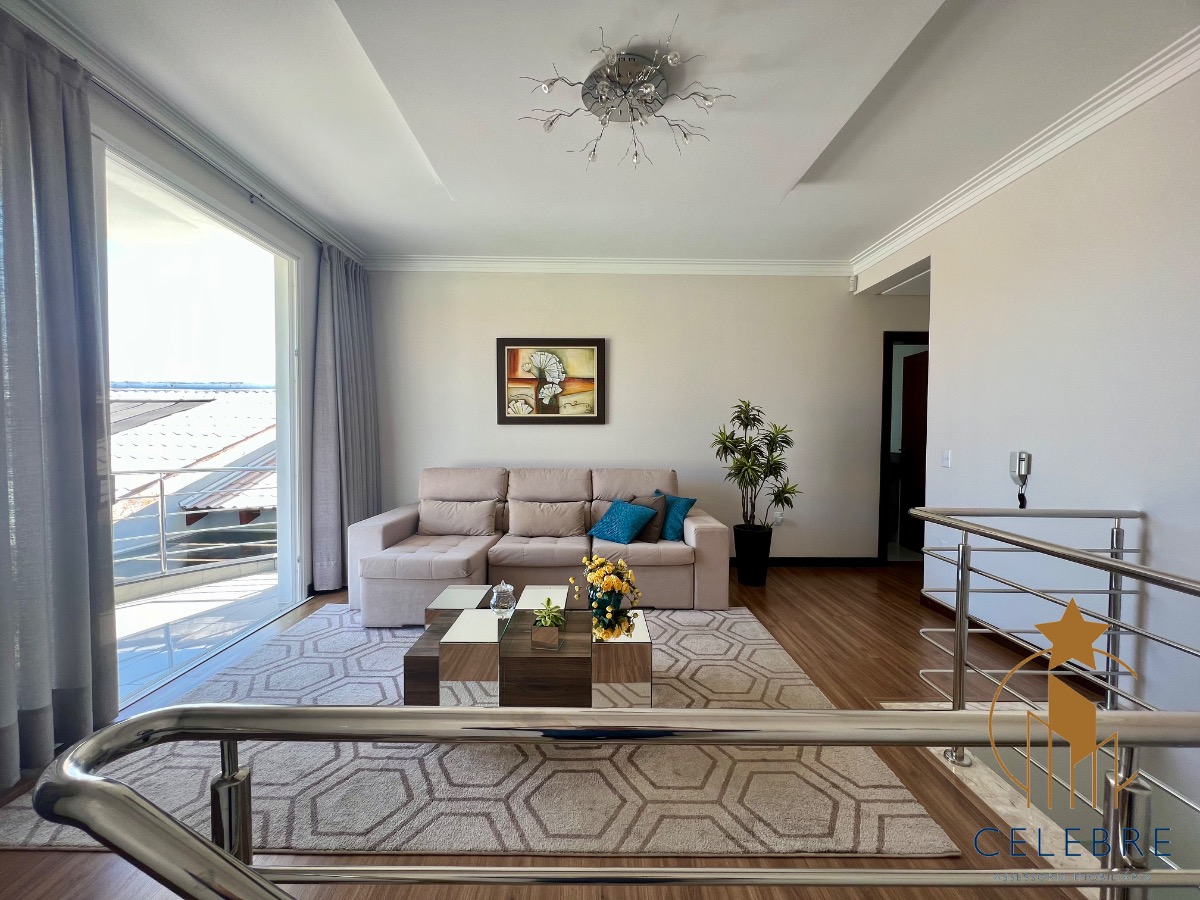 No andar superior: confortável sala de estar com sacada. Espaço muito tranquilo e privativo, perfeito para relaxar, ouvir música, ler bons livros desfrutando da vista da piscina.