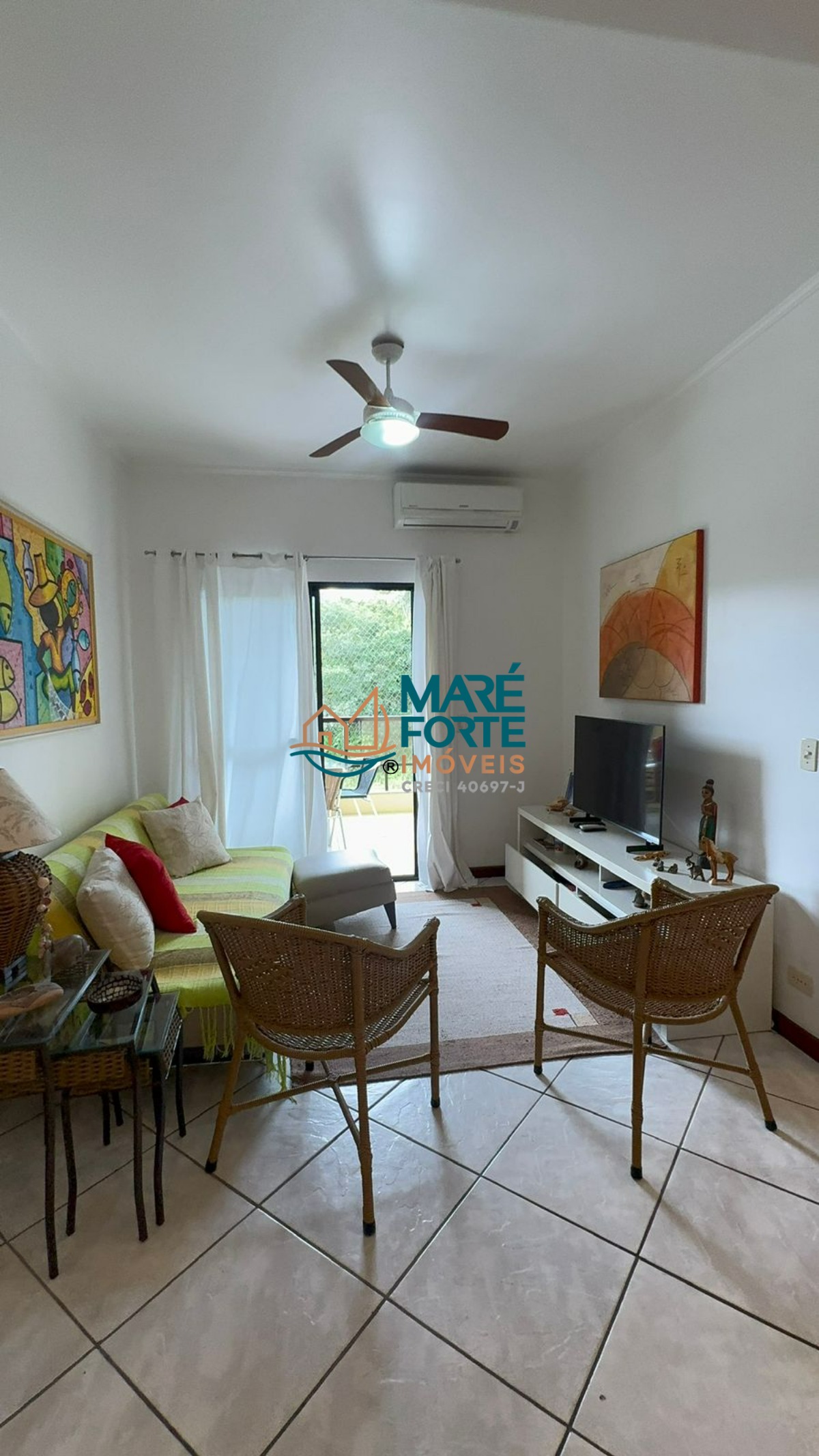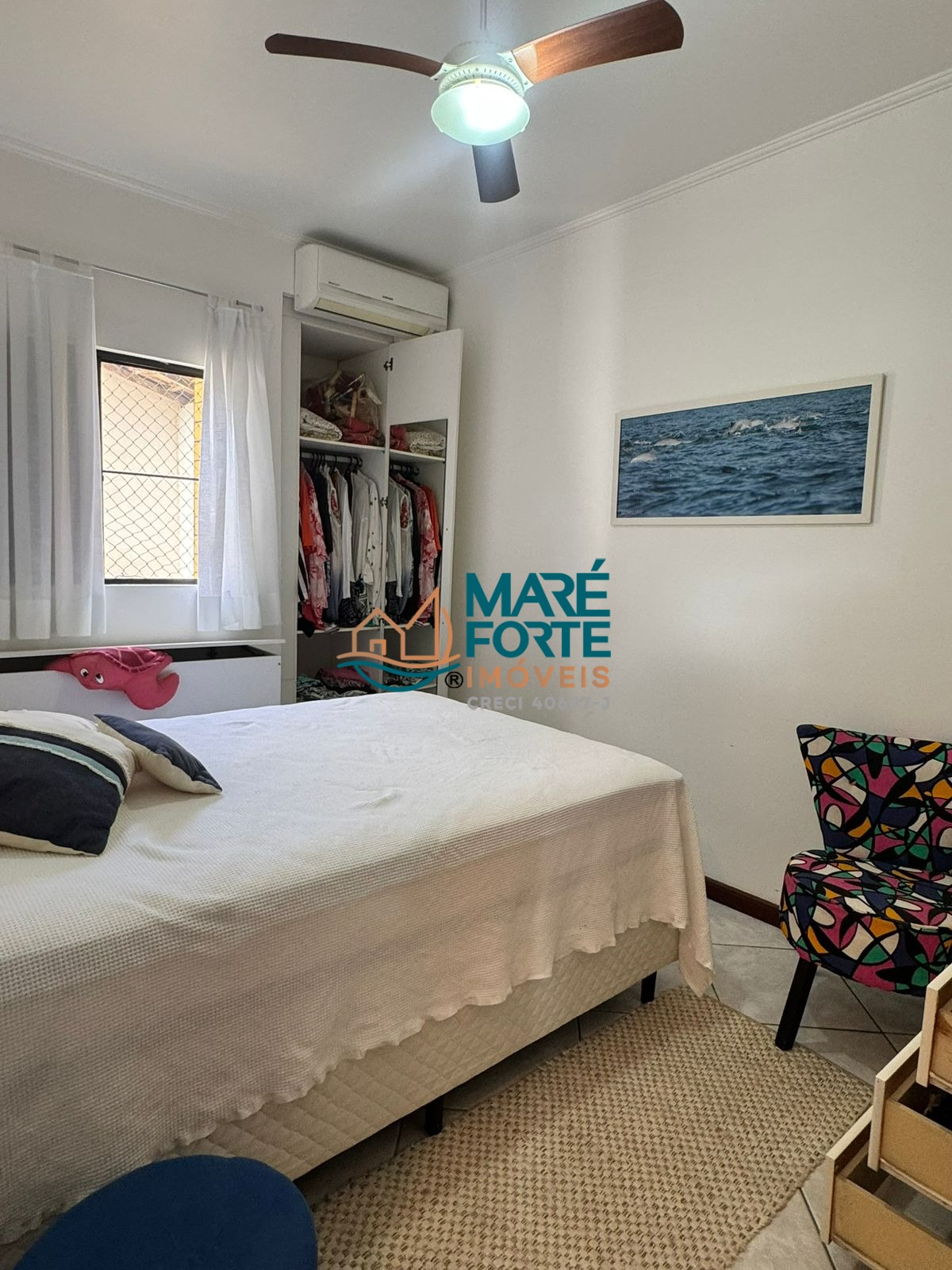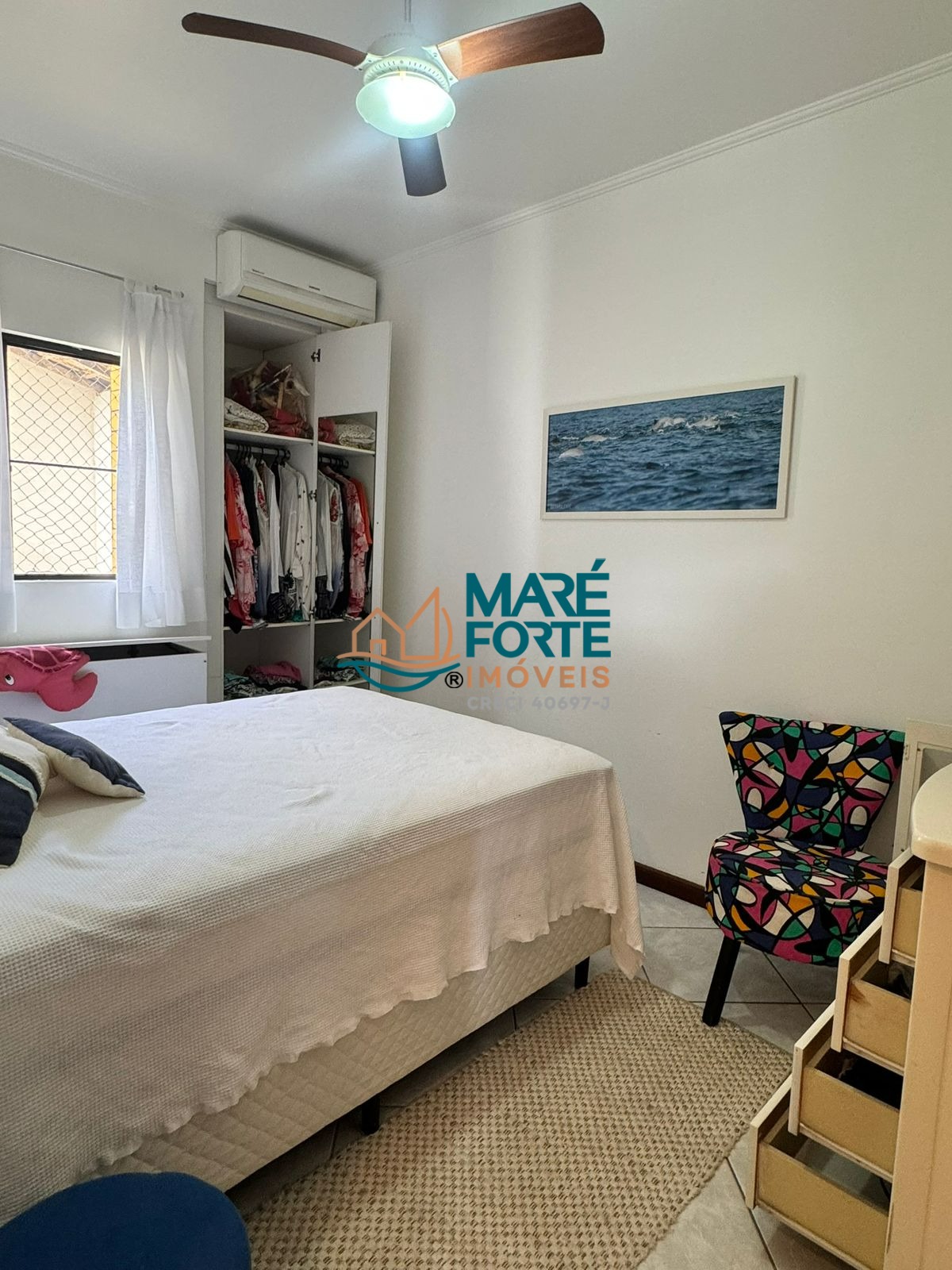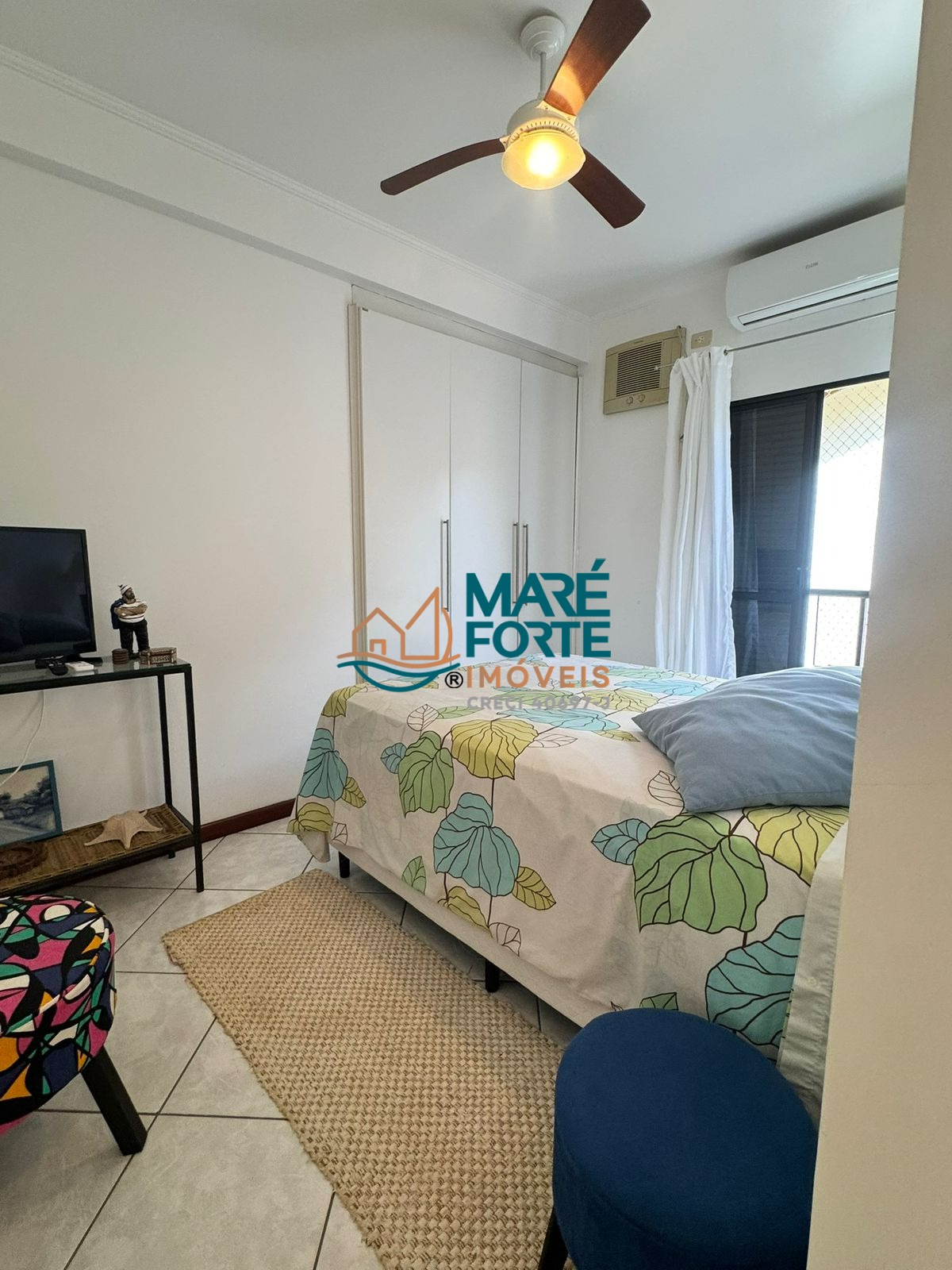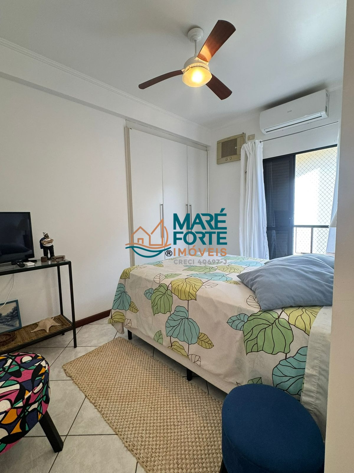 Os dormitórios incluem uma suíte, e o imóvel ainda dispõe de ventilador, ar condicionado, cozinha, área de serviço, sacada e uma garagem.