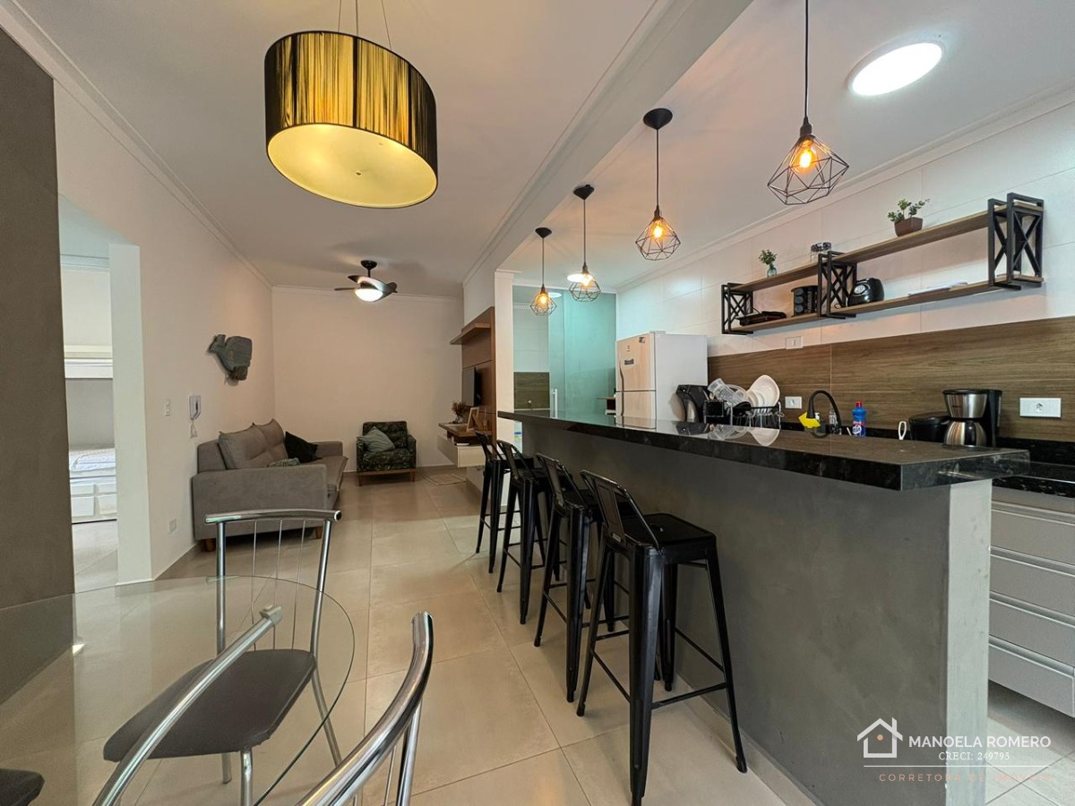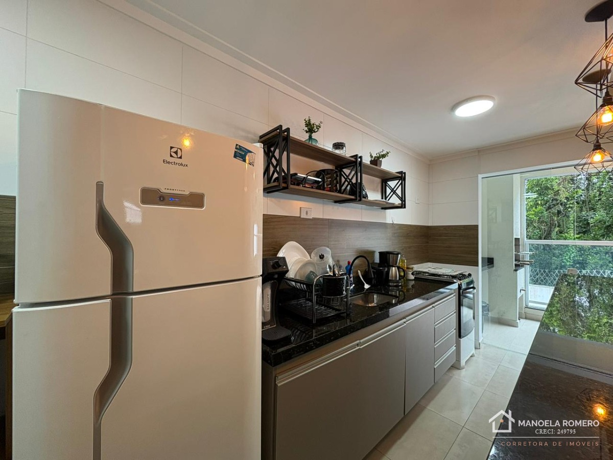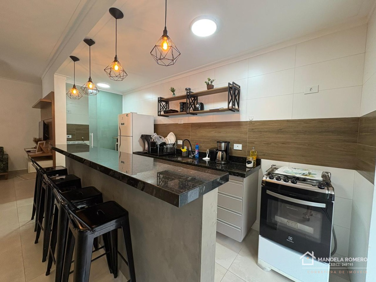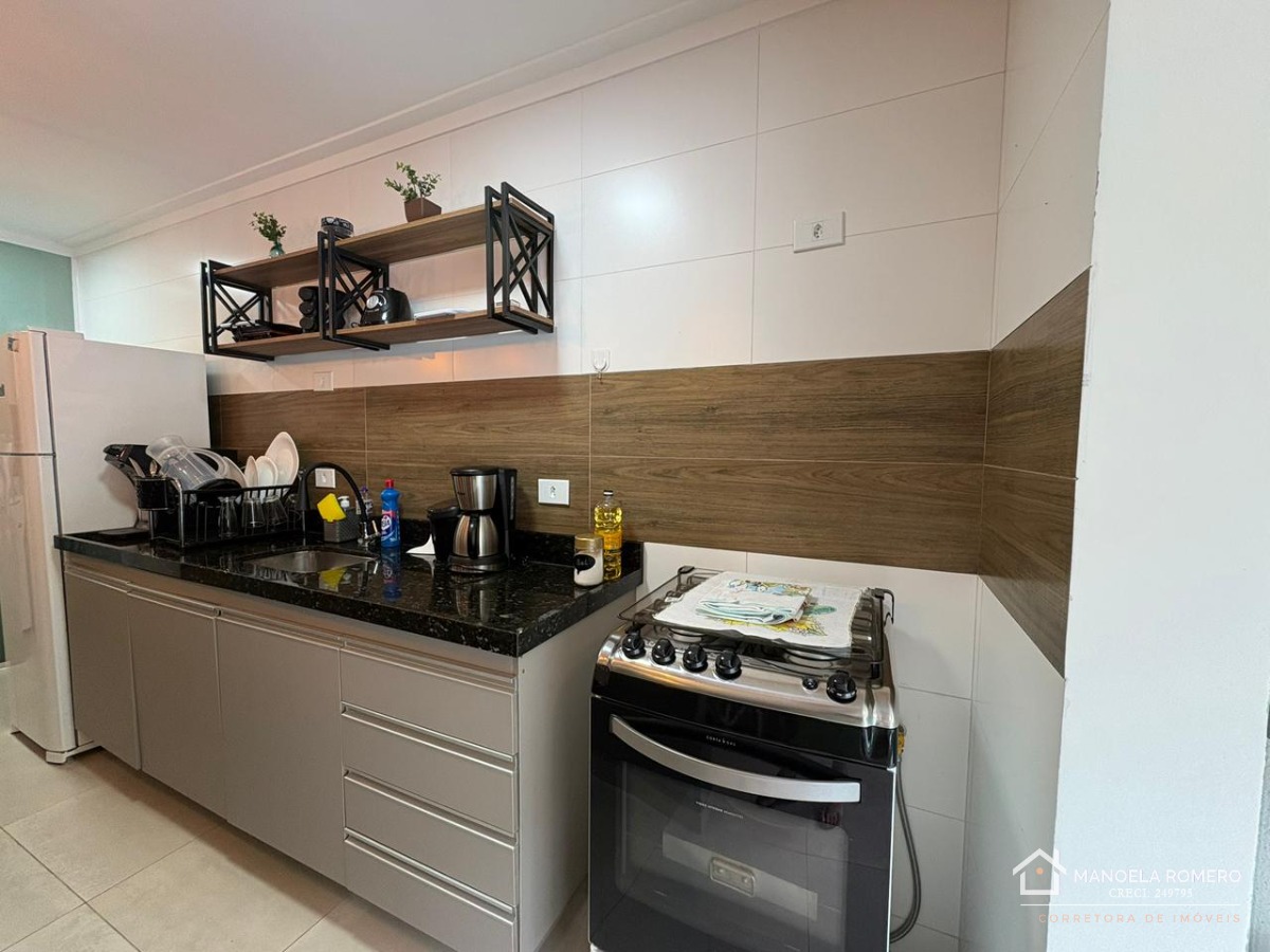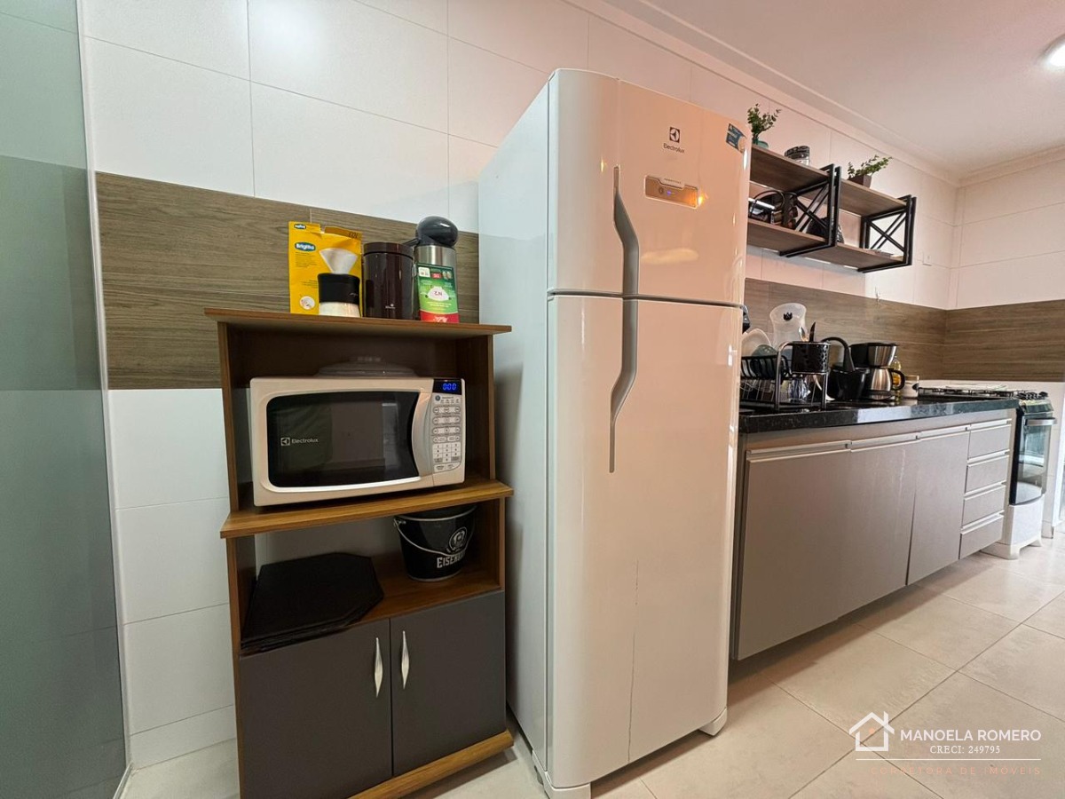 O apartamento é mobiliado e conta com armário na cozinha, facilitando a organização do espaço.