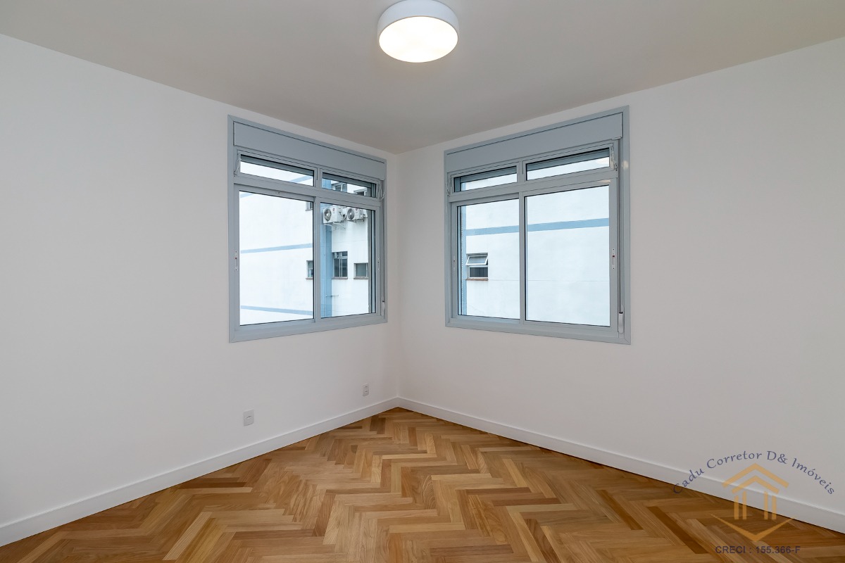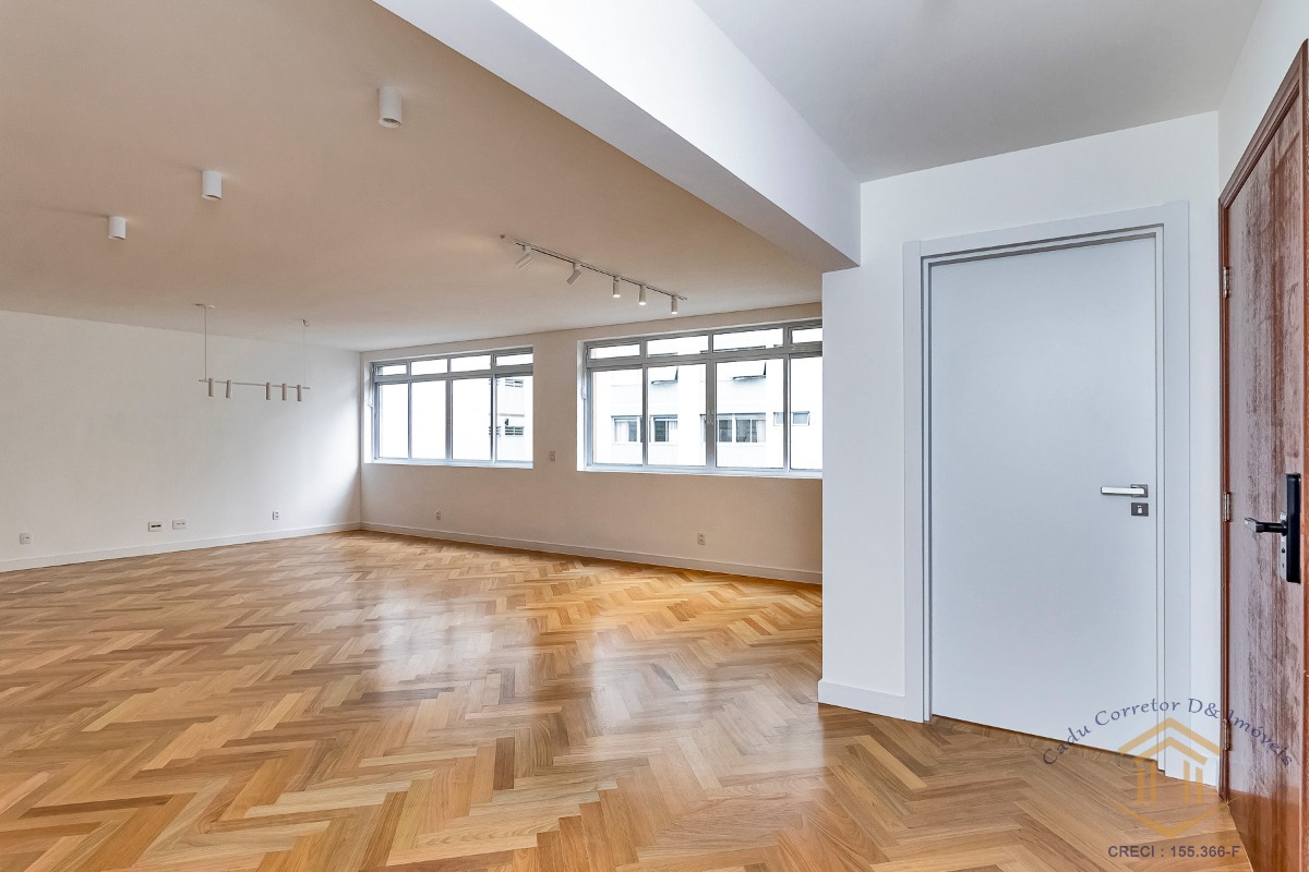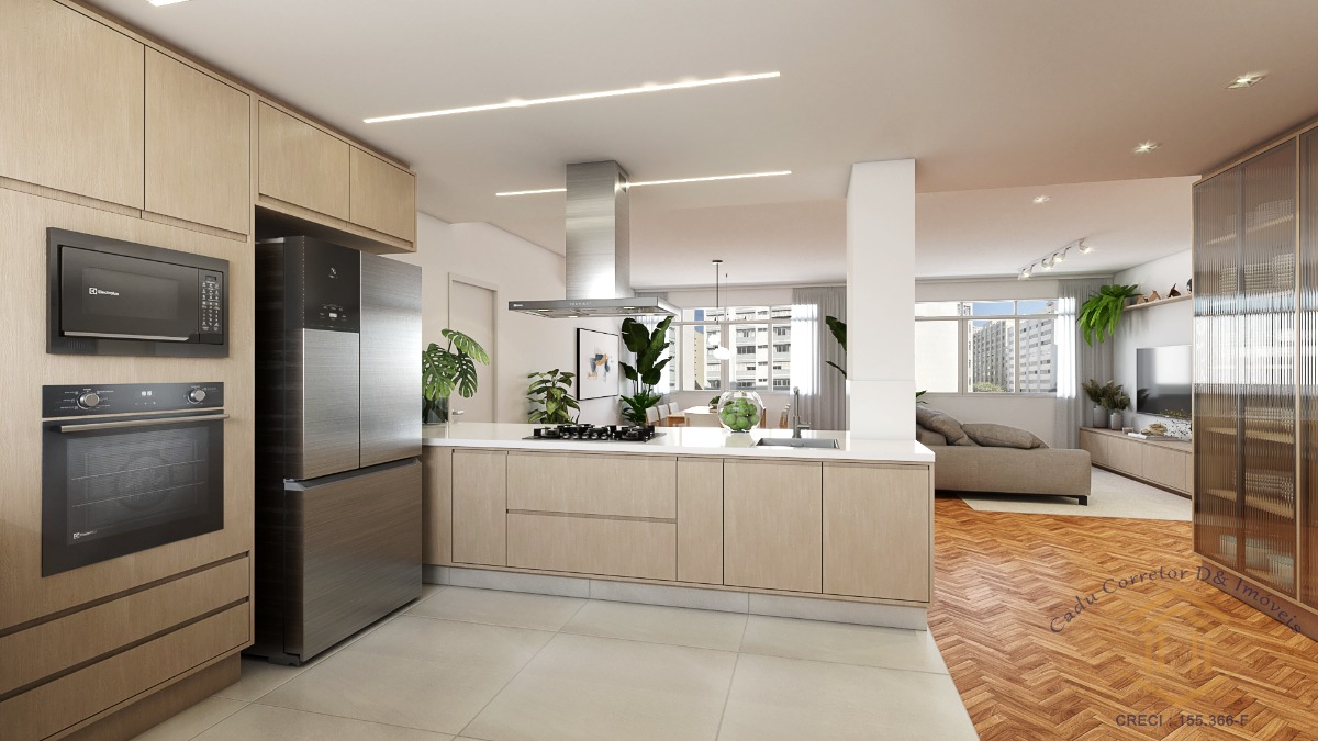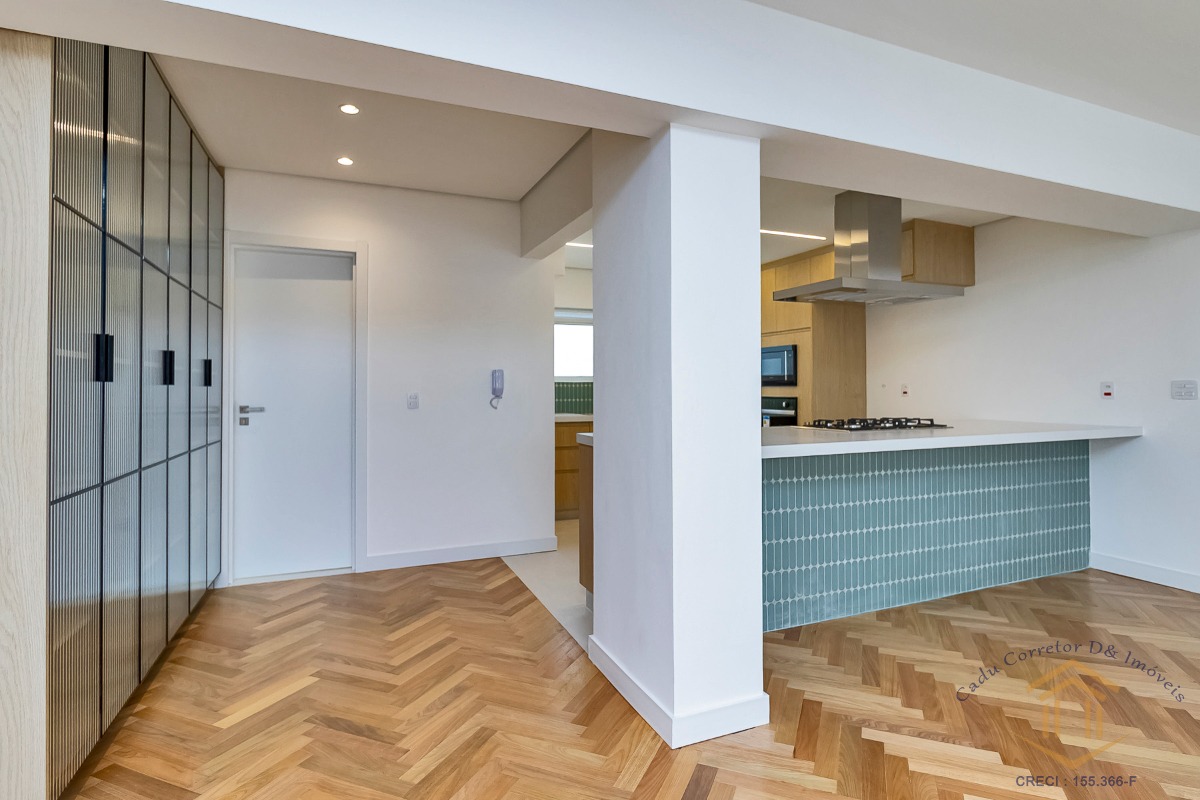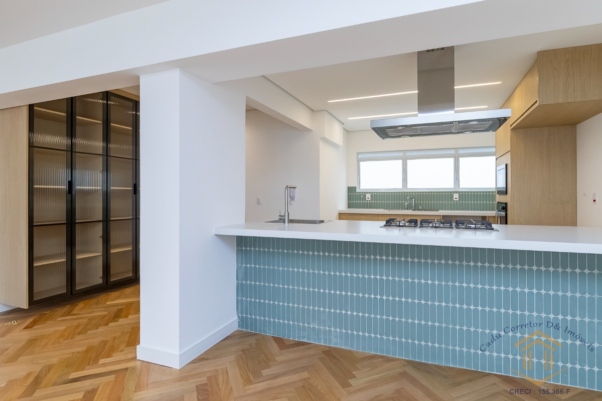 master) e integramos por completo a cozinha com a sala. Da planta original, mantivemos o simpático escritório agregado à sala, porém distante da área íntima e de serviço da casa. Ideal para quem trabalha em casa e precisa de sossego. O piso de madeira da sala, escritório e quartos é 100% novo, em tacos 7x42 de Tauari. A reforma foi feita por completo, e esse apto já vem com marcenaria na cozinha, lavanderia e banheiros, além de cooktop, coifa, forno elétrico, micro-ondas e aquecedor a gás.