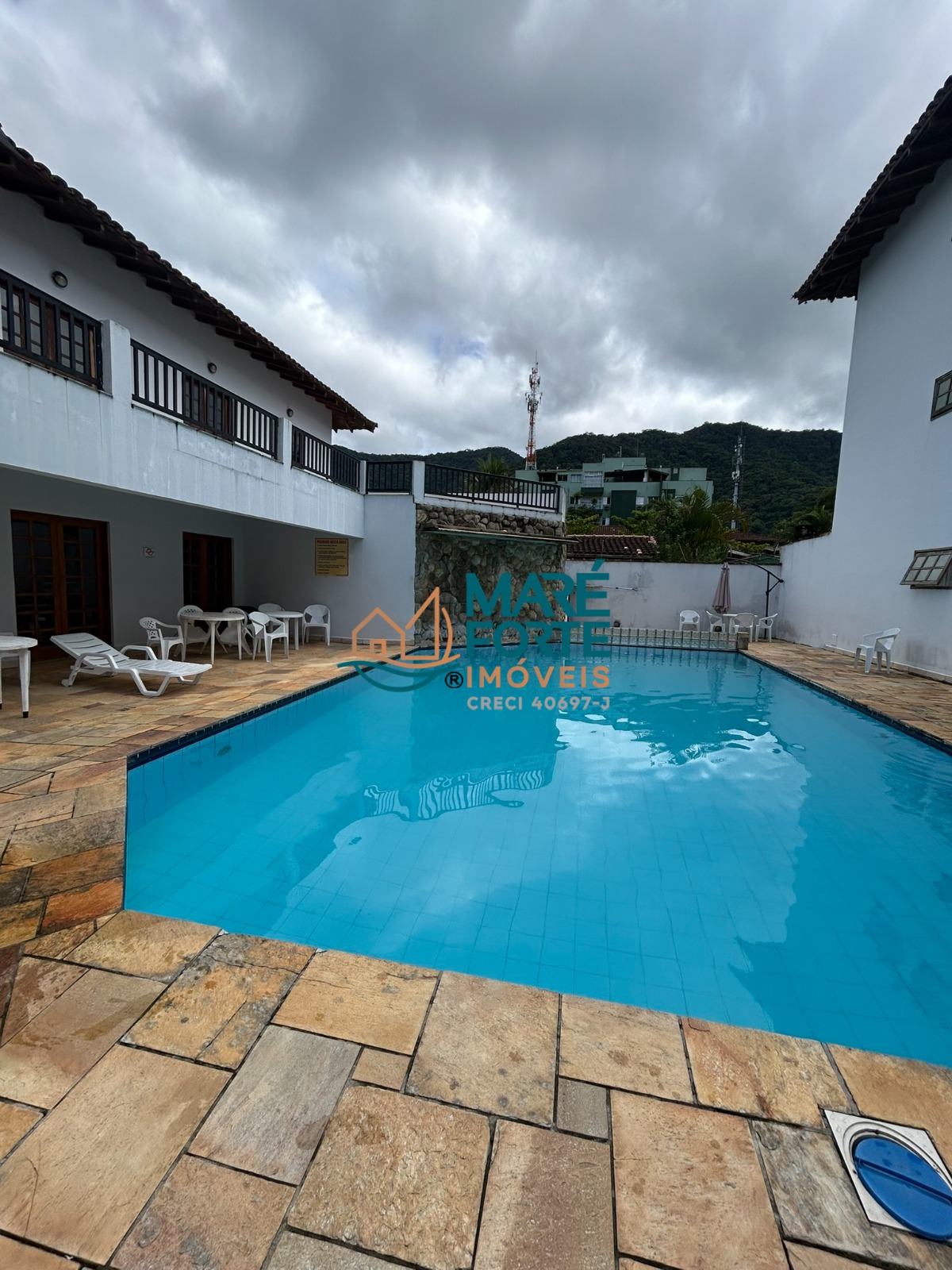 Condominio possui área de lazer completa: piscina, churrasqueira, salão de jogos, salão de festas e zeladoria.