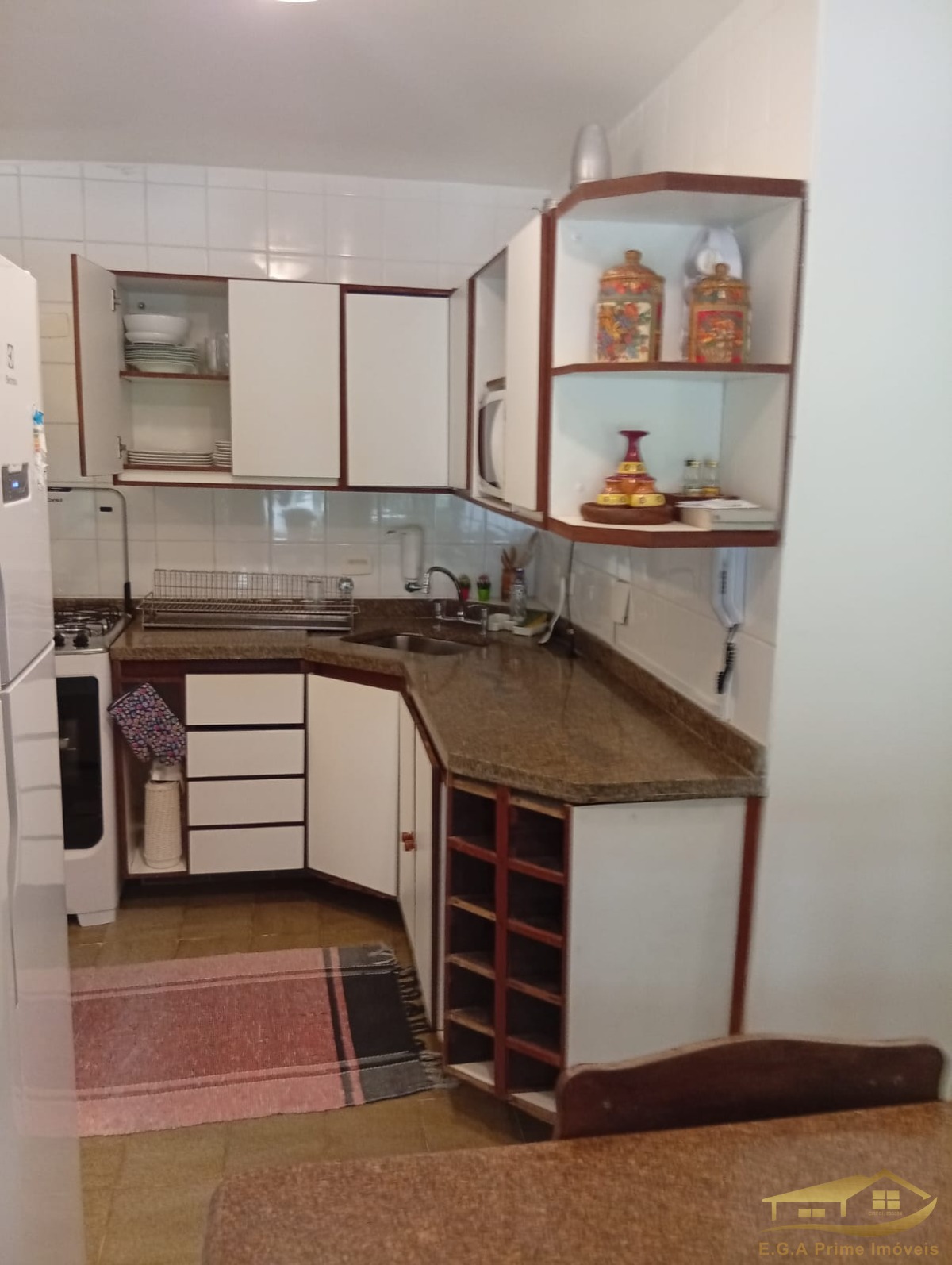 A cozinha é bem equipada e possui armários embutidos, facilitando a organização.