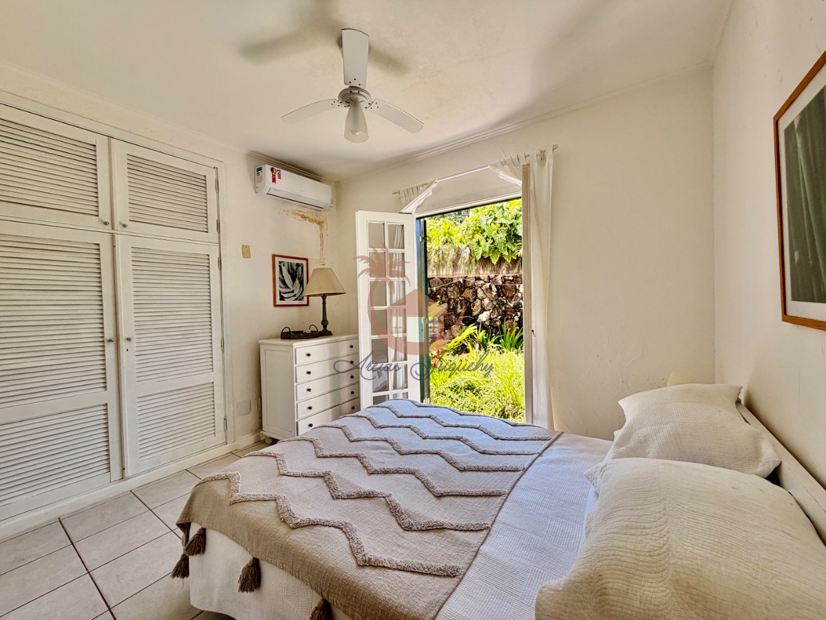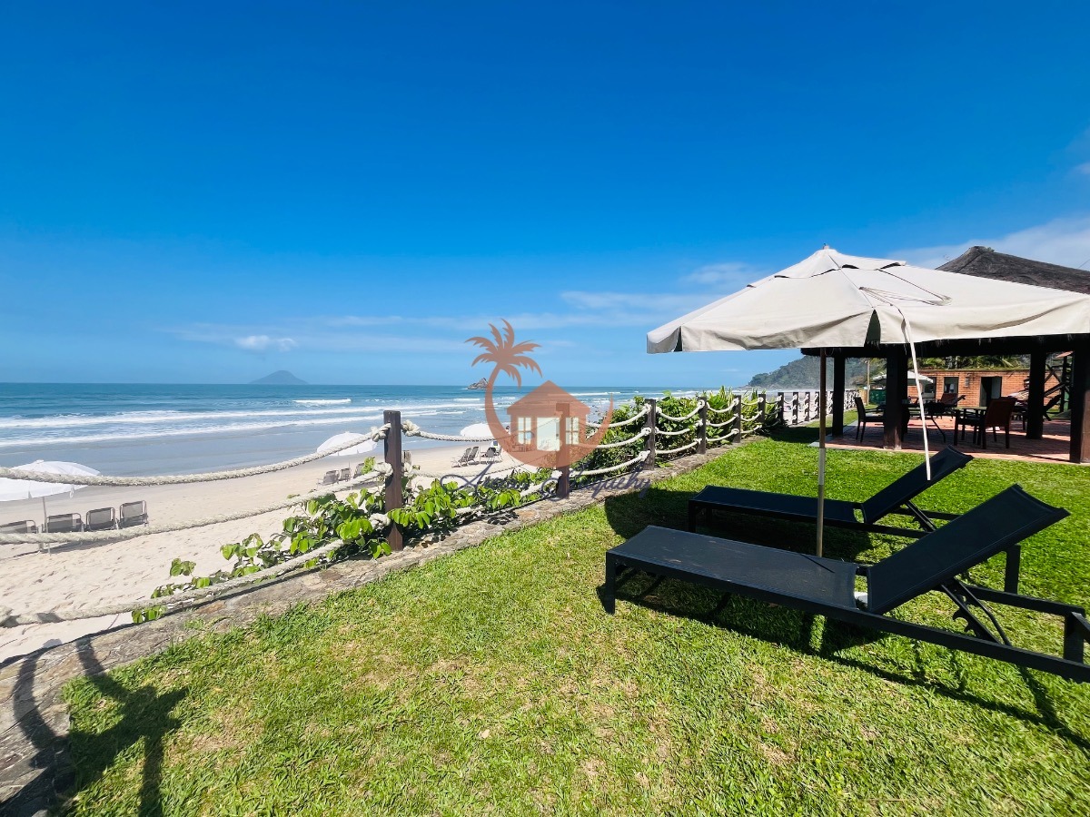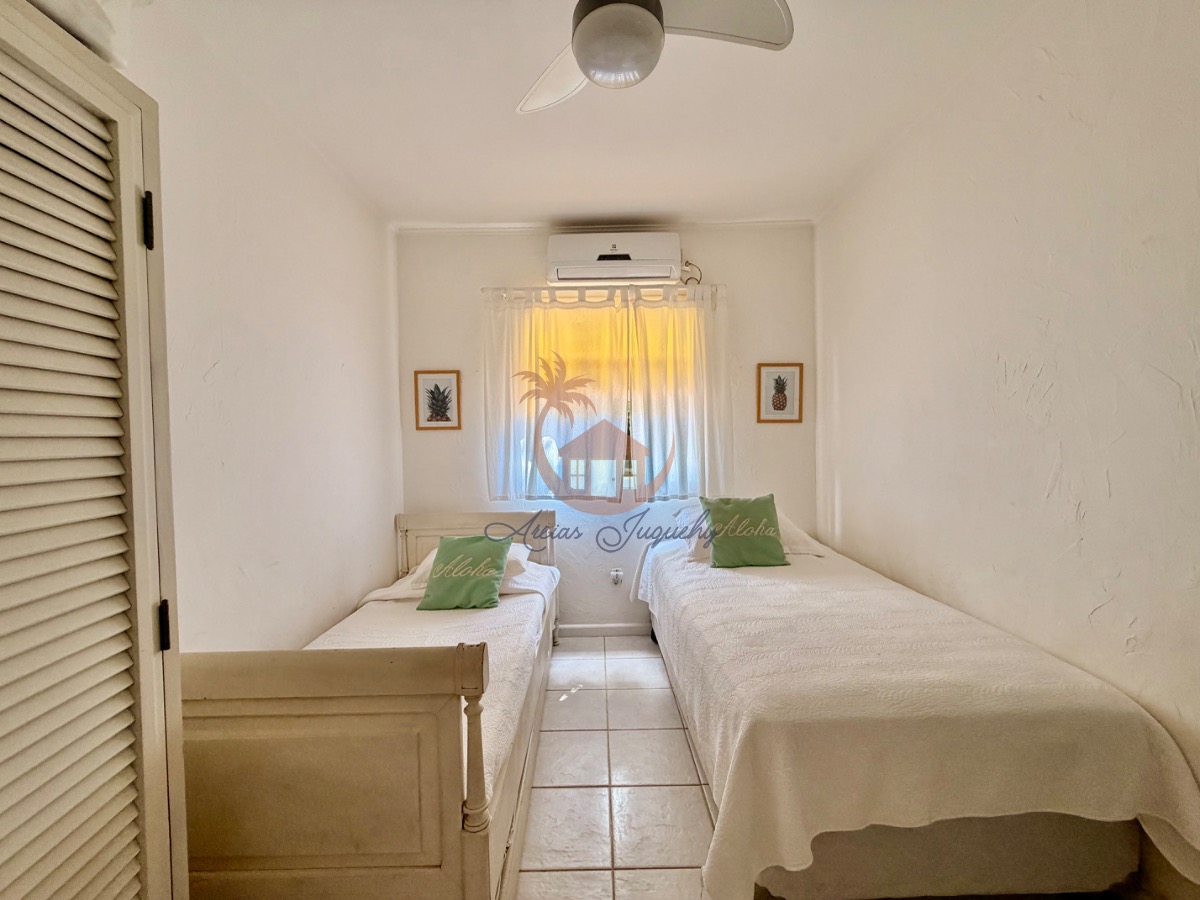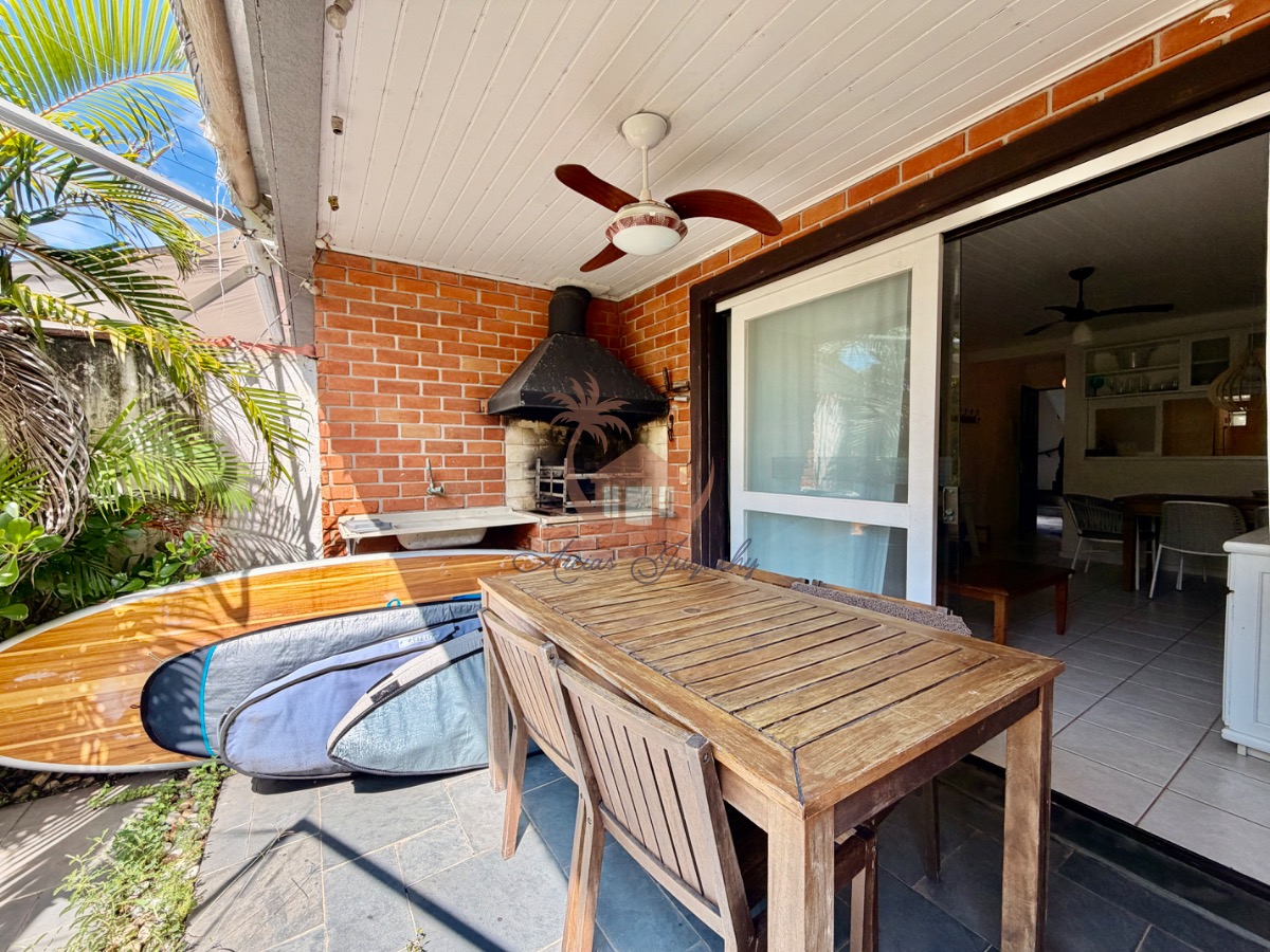 O imóvel ainda possui uma churrasqueira, ventiladores e ar-condicionado, além de uma sacada e varanda que permitem desfrutar da brisa do mar.