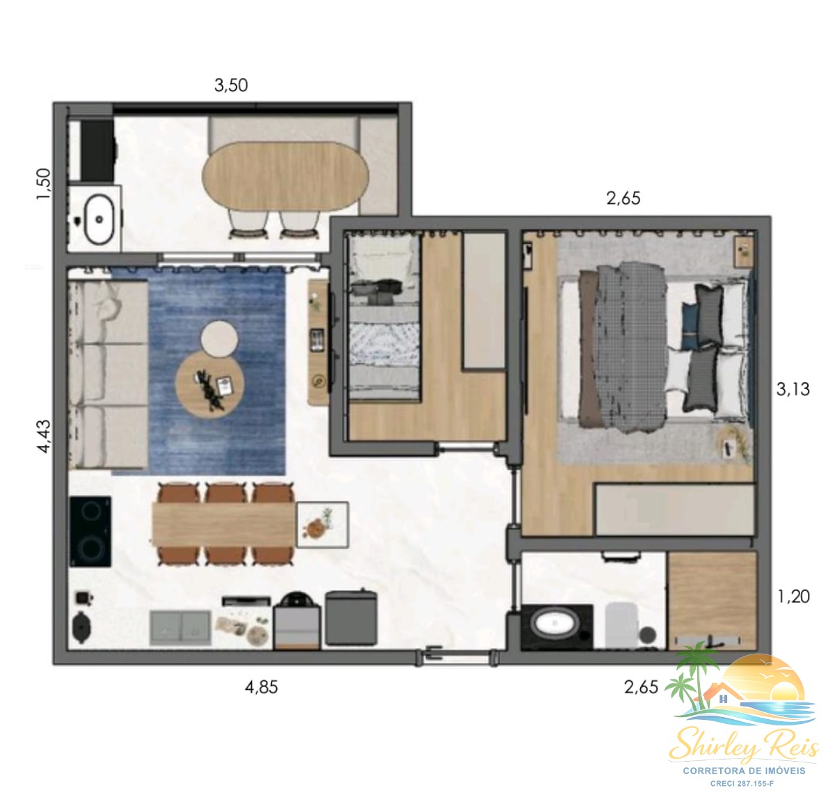 Com uma área total de 45 m², o imóvel é ideal para quem deseja viver próximo à praia, desfrutando de uma vista deslumbrante para o mar.