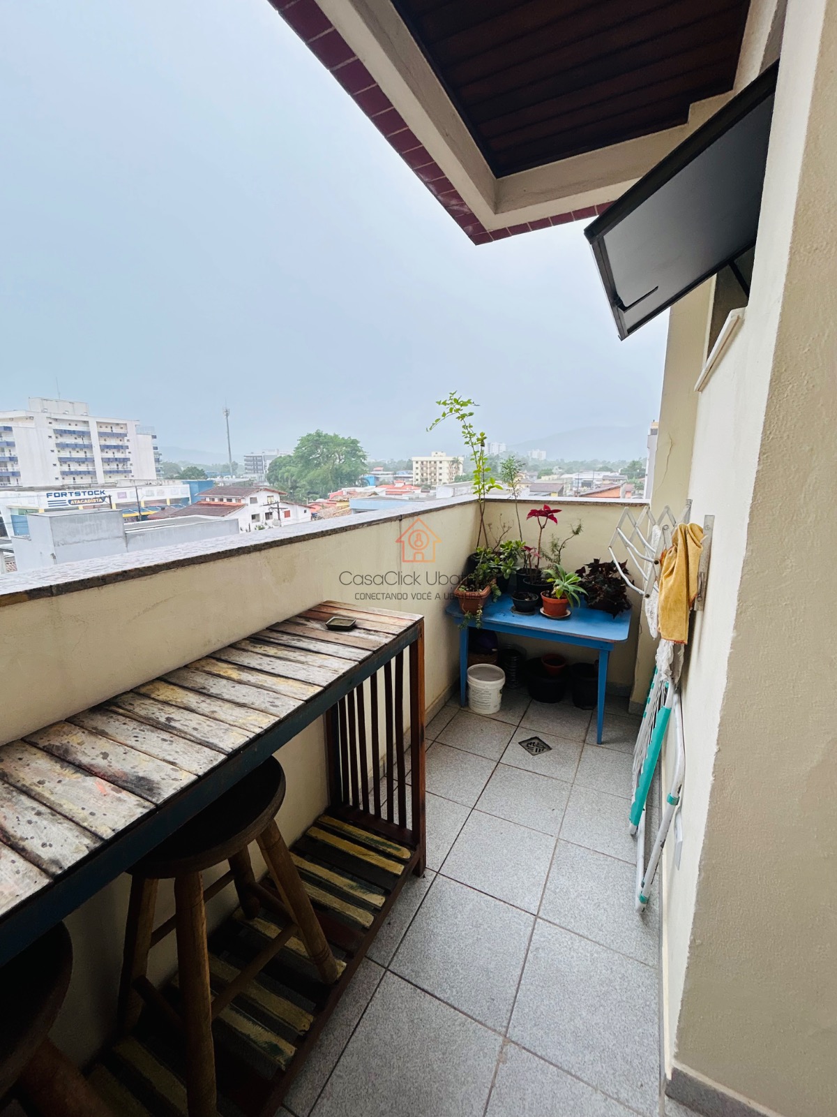 O apartamento ainda possui um ventilador, área de serviço e uma sacada que oferece uma vista relaxante.