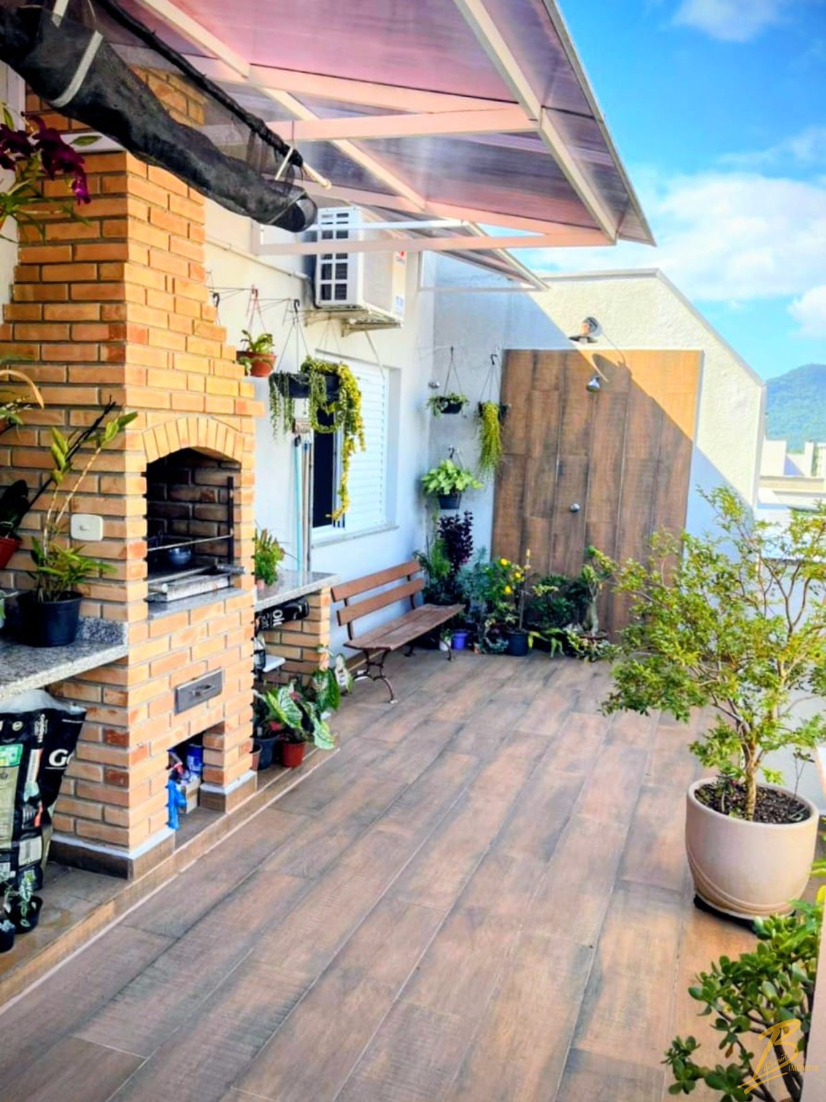 Ampla área de lazer privativa com churrasqueira, pia e ducha.