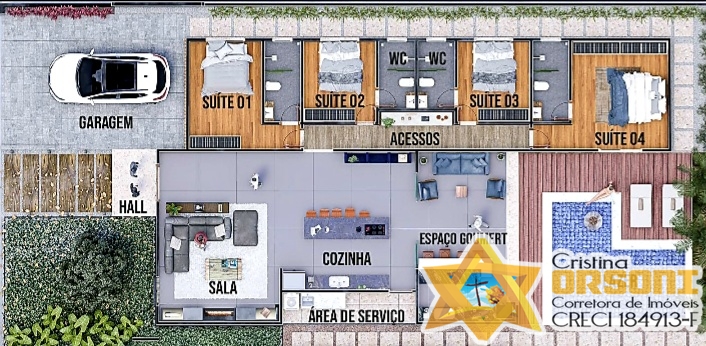 4 dormitórios, sendo 4 suítes e a master com saída para piscina.
